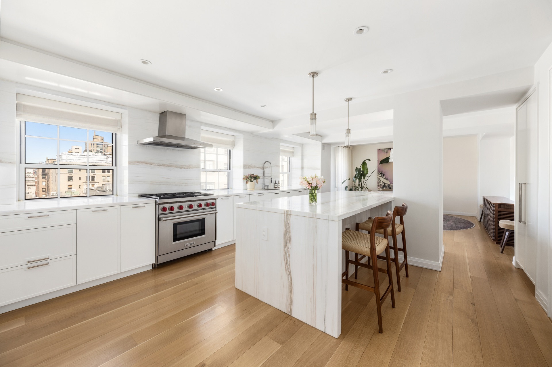 At the heart of the home, a contemporary windowed eat-in kitchen is outfitted with top-of-the-line Wolf and Sub-Zero appliances and anchored by a striking waterfall island clad in Covelano Oro marble. The adjacent dining area accommodates both everyday living and larger gatherings, while custom storage is integrated throughout.
