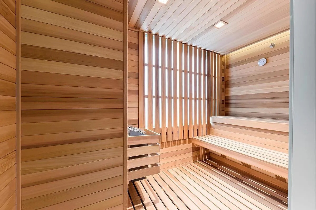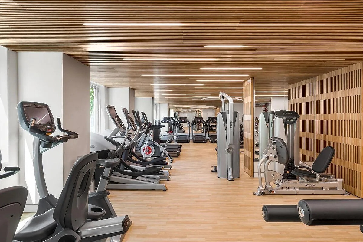 - Windowed fitness center that offers yoga, cardio, and weight equipment as well as men's and women's saunas