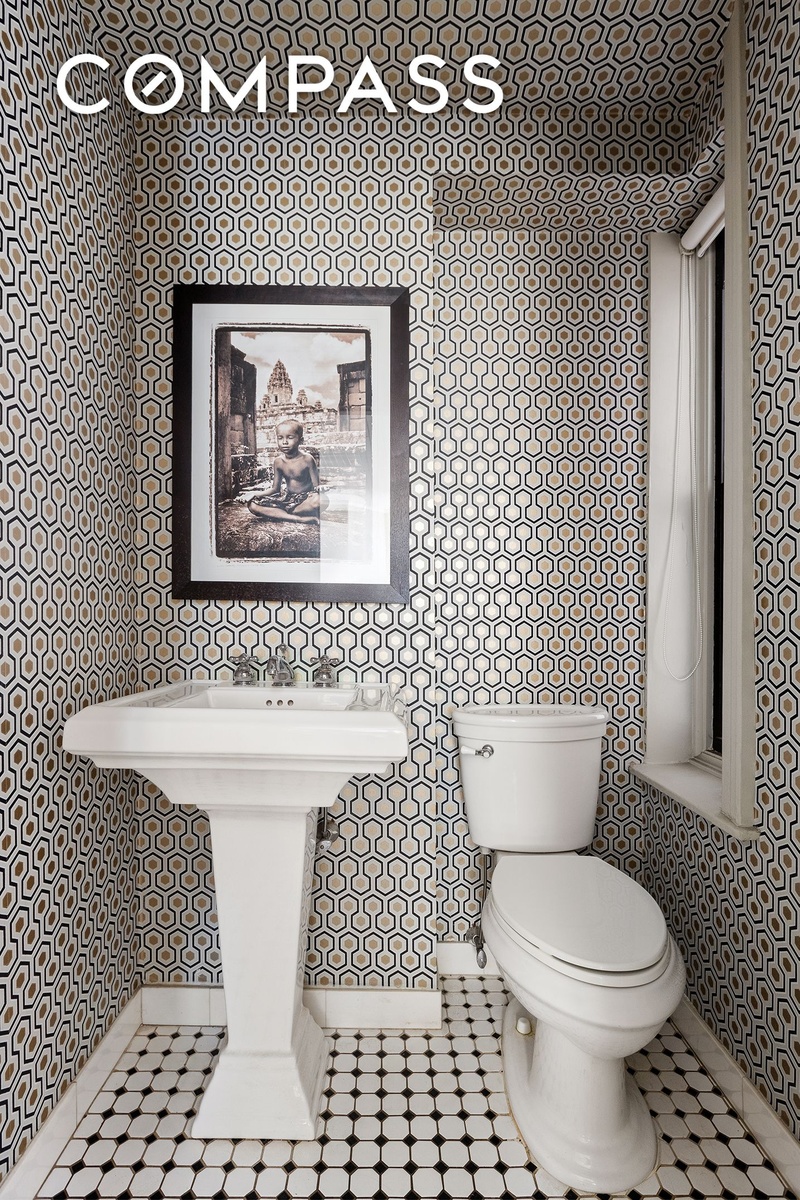 The sunny south-facing living room has a decorative fireplace and is comfortable and spacious. The well-proportioned dining room is adjacent to a bright, white chef’s kitchen. Outfitted with top-tier stainless steel appliances, including Sub-Zero, Bosch, and GE Profile, along with granite countertops and a classic white tile backsplash, the kitchen is as functional as it is stylish. A chic powder room and a dedicated laundry/storage room with an LG washer/dryer complete the thoughtful layout of this area.