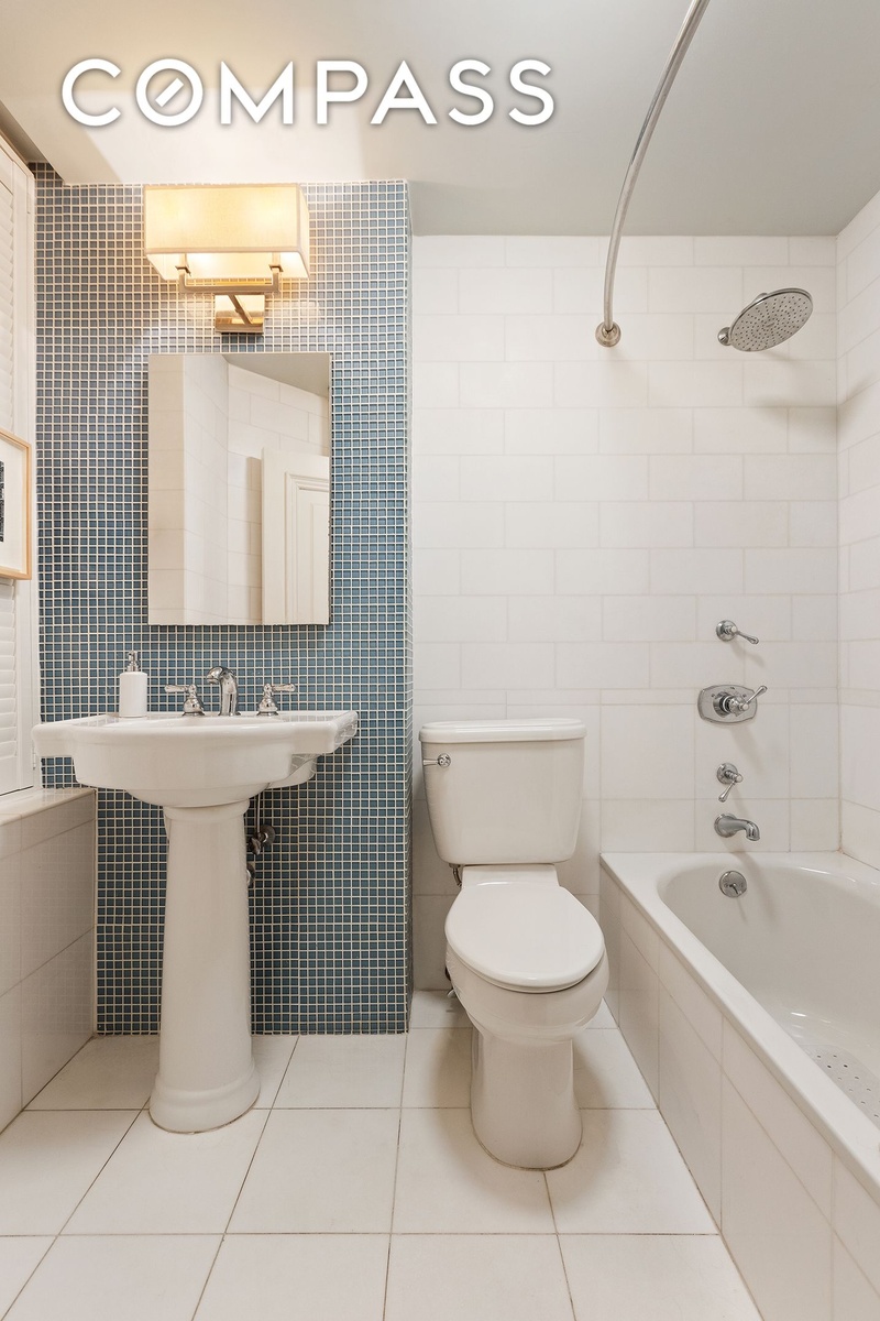 A wide hallway perfect for showcasing art leads to the private bedroom wing with the three generously sized bedrooms radiating from a central gallery space. The king-sized primary bedroom features a large fabulously fitted walk-in closet and an en-suite bathroom with a wall of French blue glass tile and an oversize soaking tub. The second and third bedrooms are both exceptionally spacious with two exposures and ample closets, including two fitted closets in the second bedroom. The second full bath features classic white subway tile, a light blue and white glass tiled floor and a pedestal sink. A windowed home office/storage adds even more versatility to this wing.