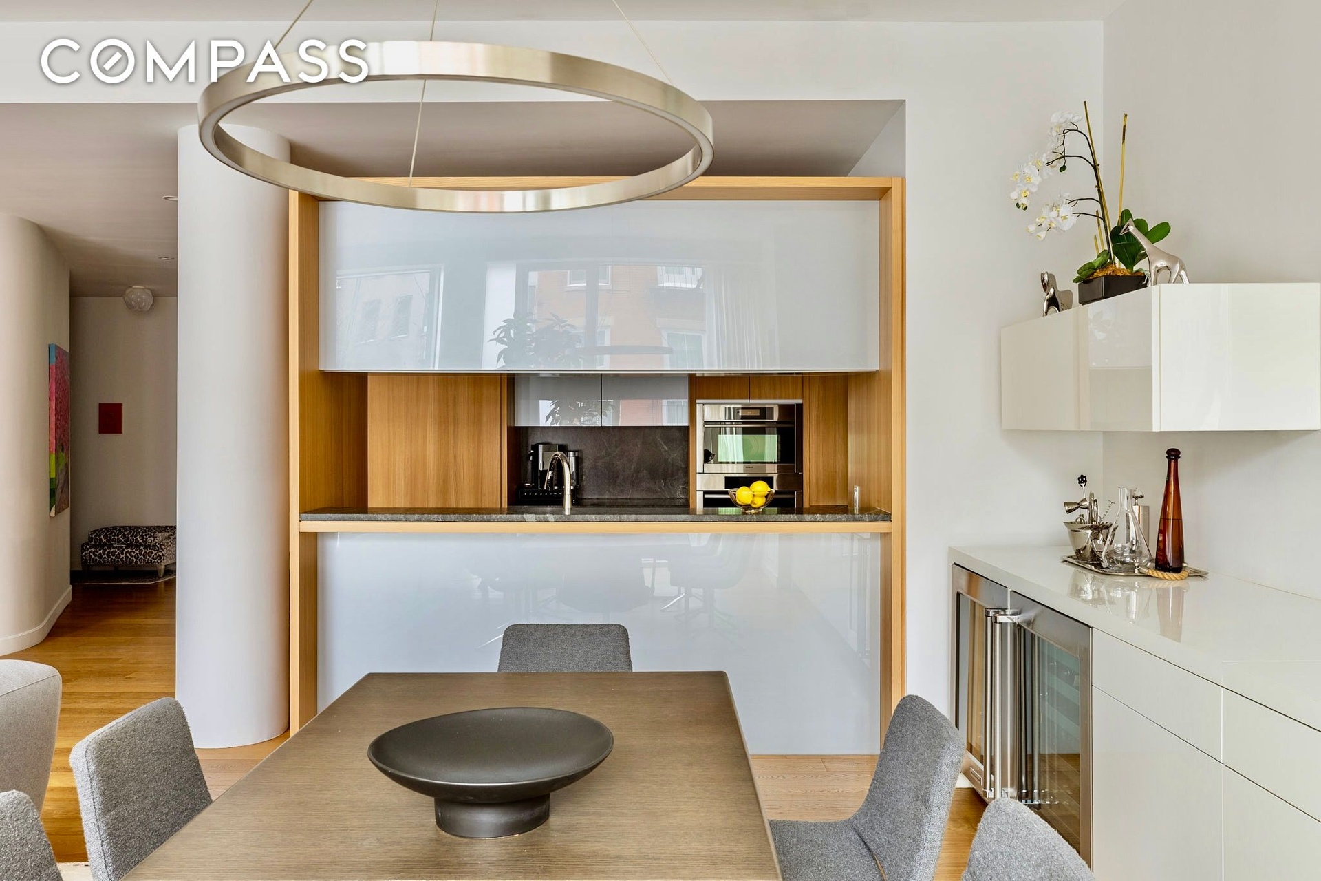 The expansive living and dining areas are designed for seamless entertaining, enhanced by custom millwork, bespoke blinds, and integrated surround sound throughout. The dining area is anchored by striking custom lacquered cabinetry with multiple built-in wine refrigerators, creating both a dramatic visual statement and effortless functionality for hosting. The kitchen flows naturally into the main living spaces, making the apartment equally suited for intimate evenings or larger gatherings.