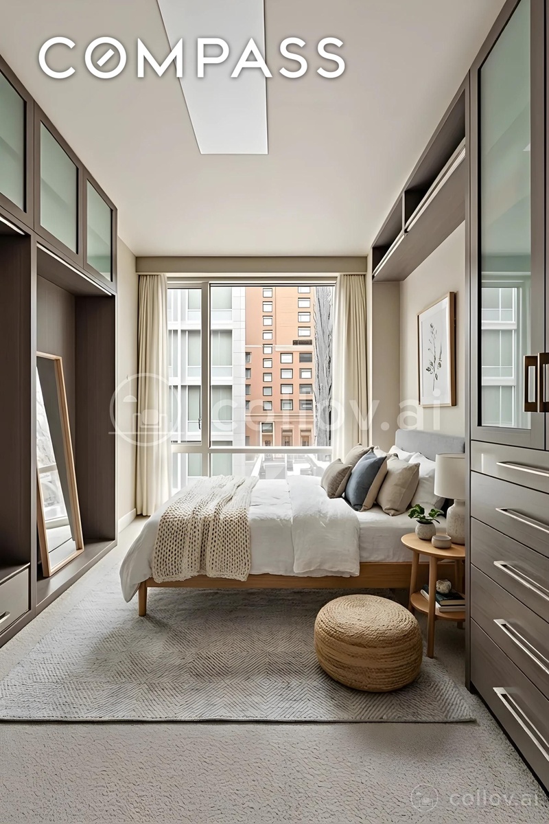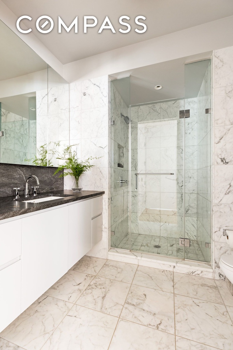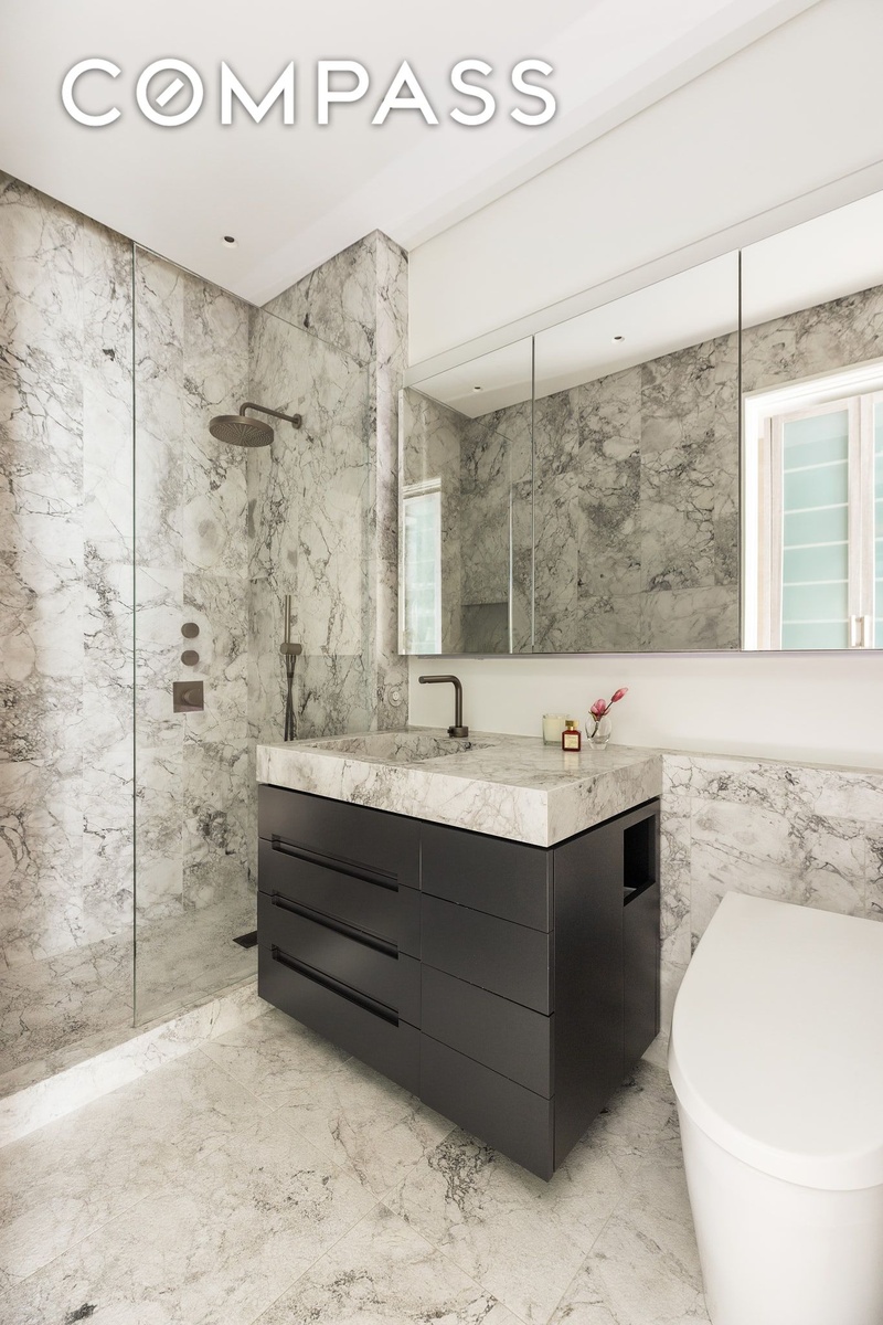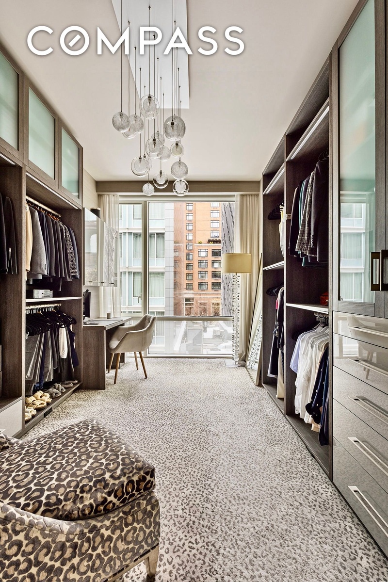 The adjacent bedroom has been thoughtfully transformed into a spectacular dressing room and home office, featuring extensive custom cabinetry and storage rarely found in Manhattan homes. This space is complemented by a luxurious en-suite bath, a custom vanity, abundant storage, and exquisite marble finishes.