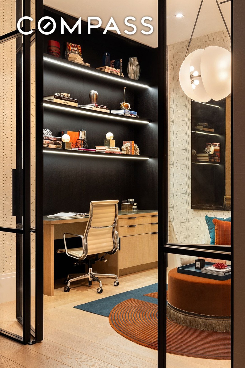 Behind glass and metal casement doors, the home office and den is completely built out with furniture-quality millwork and Apparatus lighting, with a third full bathroom across the hallway.