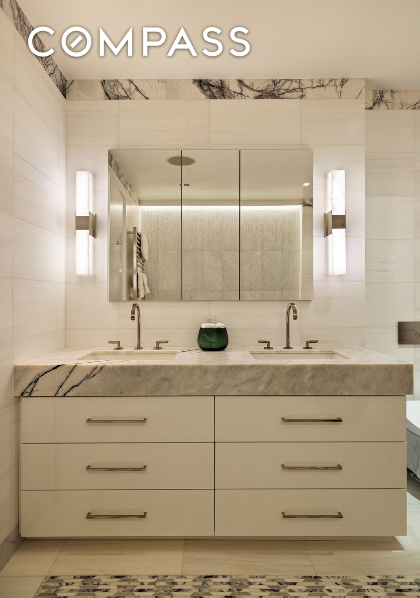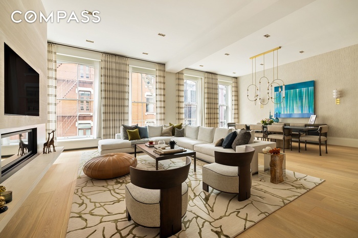 The desired scale and quality one envisions in this price point is on full display the moment you enter the loft. A grand 30’ x 42’ living space is framed by four oversized architecturally stunning facing windows east over pin drop quiet Greene Street, inviting all-day natural light. The open kitchen features floor-to-ceiling custom millwork cabinetry in a blend of oak and lacquer, centered on a massive marble island with seating. The appliance package includes double Miele ovens, a SubZero refrigerator and freezer, and wine storage.