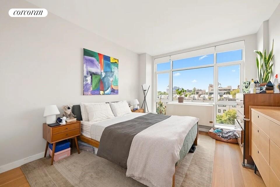 Bright, top-floor one-bedroom at be@Schermerhorn featuring oversized south-facing windows, open city views, and hardwood floors throughout.
