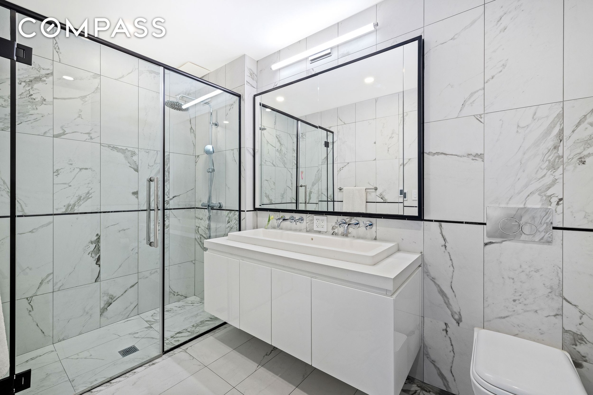 The primary suite features a walk-in closet and a spa-like bath with heated floors, marble finishes, and a glass-enclosed shower. A well-proportioned second bedroom sits near a stylish secondary bath.