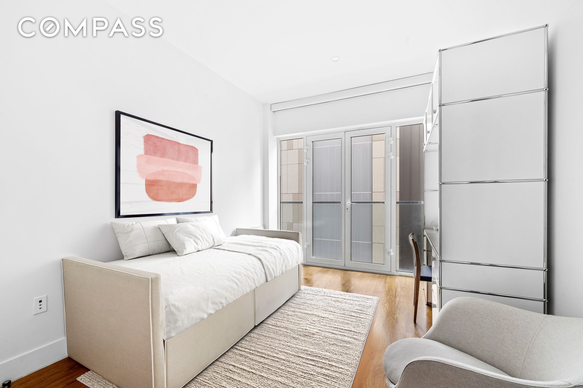 Residence 5A is a bright corner 2-bed, 2-bath with floor-to-ceiling French casement windows, high ceilings, and white oak floors throughout. The home is pre-wired for smart features and includes Mitsubishi heating/cooling and a Bosch washer/dryer.