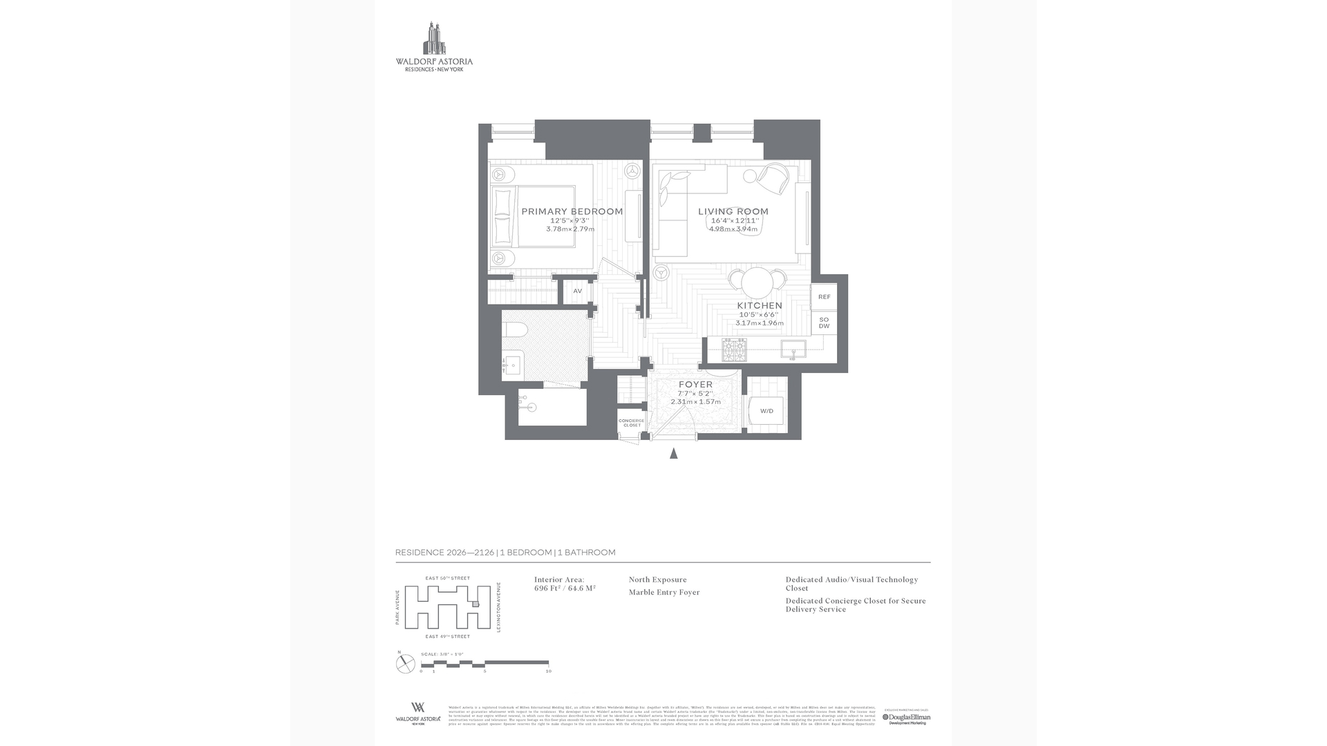 Own a piece of history at the Waldorf Astoria Residences New York. Residence 2026, a 696 SF one-bedroom, one-bath home with northern views. All interiors have been crafted by AD100 designer Jean-Louis Deniot and deliver a balance of modern comfort with Art Deco opulence.