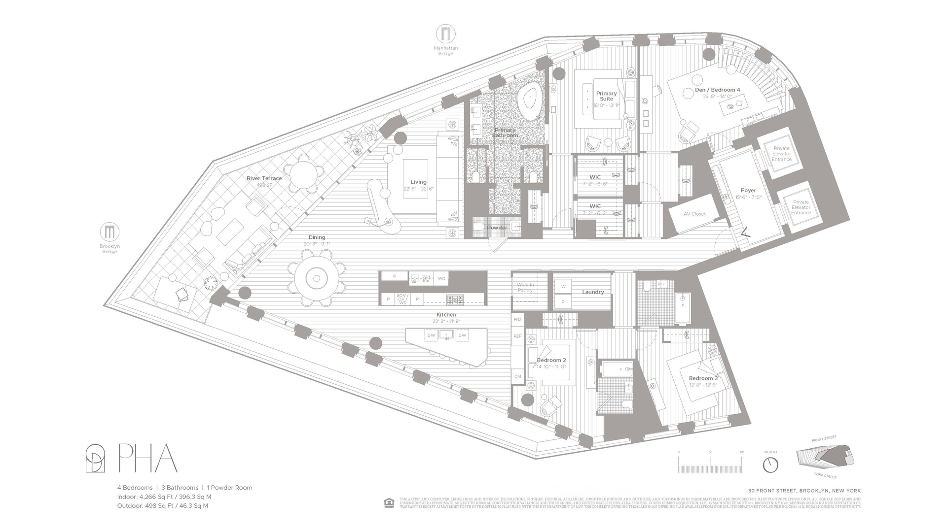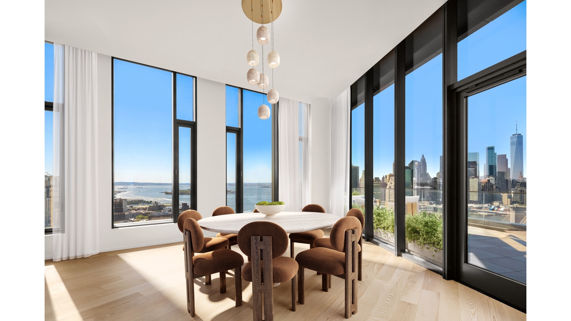 With 360 views and a private 498 SF river-facing terrace, this four-bedroom, three-and-a-half bath penthouse is 4,266 SF of entertaining perfection. Perched atop of Olympia Dumbo, PHA spans across the entire top floor, boasting breathtaking views from the 33rd floor, and ceiling heights up to 13'.