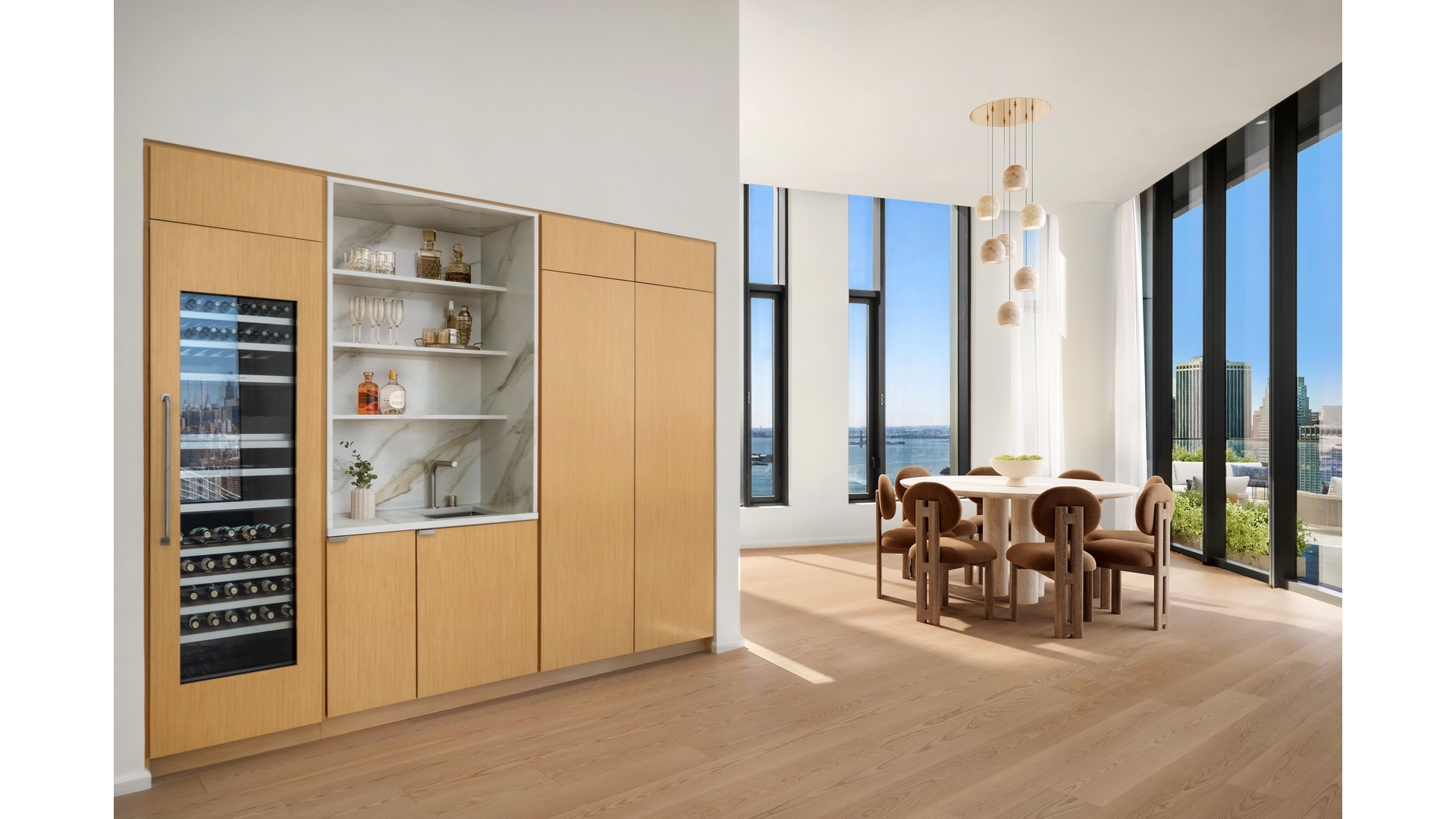 Arriving home via elevator to a private landing, the formal foyer and gallery lead to the sun-filled living and dining areas, highlighting remarkable views of the Brooklyn Bridge, Manhattan and New York Harbor. The living area is finished with a wet bar featuring white maple cabinetry, Calacatta Vagli Oro marble backsplash, stainless sink and a Thermador wine cooler.