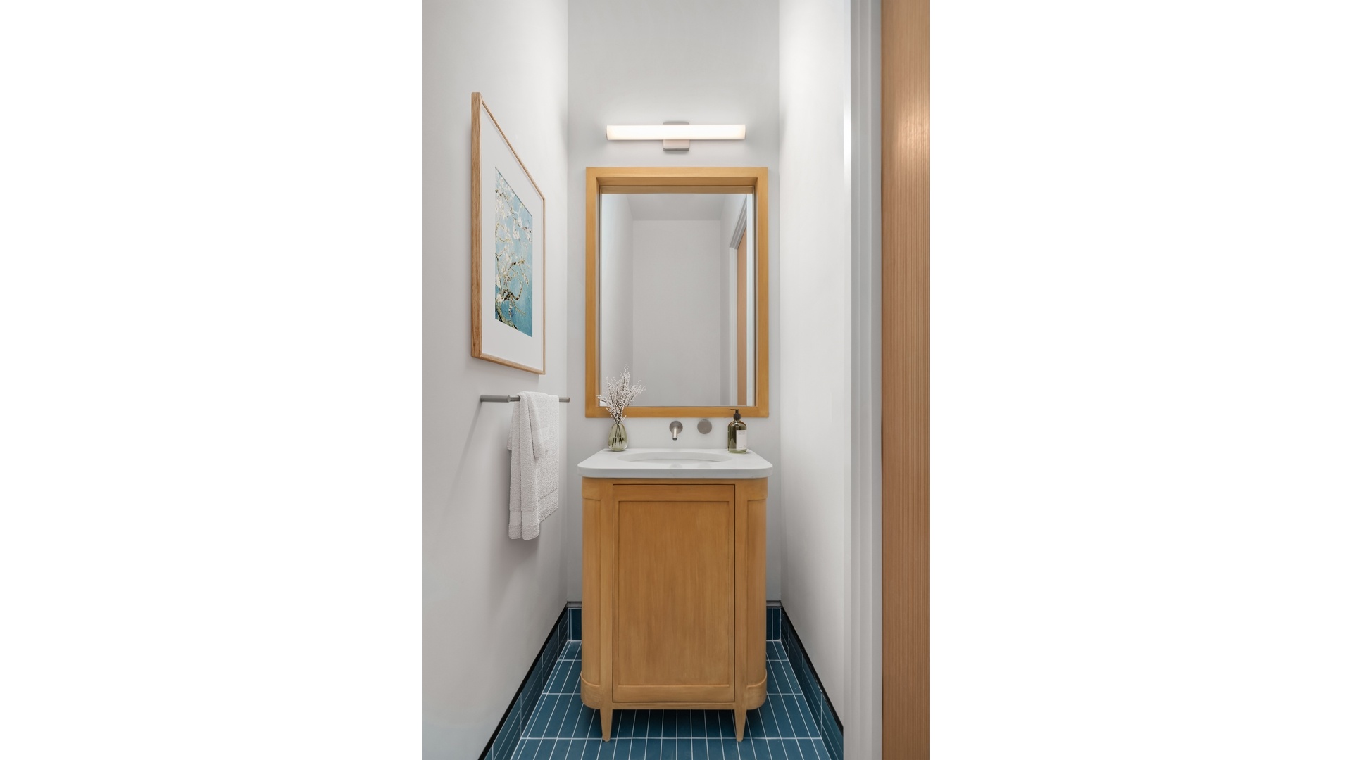 The Workstead-designed kitchen is stylishly separated from the main living area and features a spectacular island with Calacatta Vagli Oro marble and chamfered edges, white maple cabinetry paired with satin nickel hardware, Gaggenau appliances and a separate walk-in pantry. A laundry room with side-by-side LG W/D, and the powder room are discreetly located off the main hallway. The powder room features a custom vanity with a stone top, and Federal Blue tile floors.