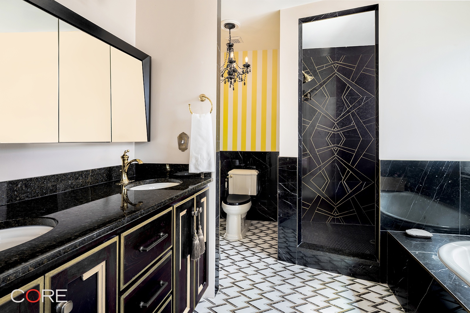 The three bedrooms overlook the second 240 SF terrace, which is accessed from the primary bedroom. The chic en-suite bath has a double sink vanity, whirlpool soaking tub, towel warmer, and a beautiful-spa shower stall. The apartment boasts a large laundry room with a full-size washer and vented dryer, a second bath, eight closets, including three walk-ins, and mini splits for individually controlled heating and air conditioning.