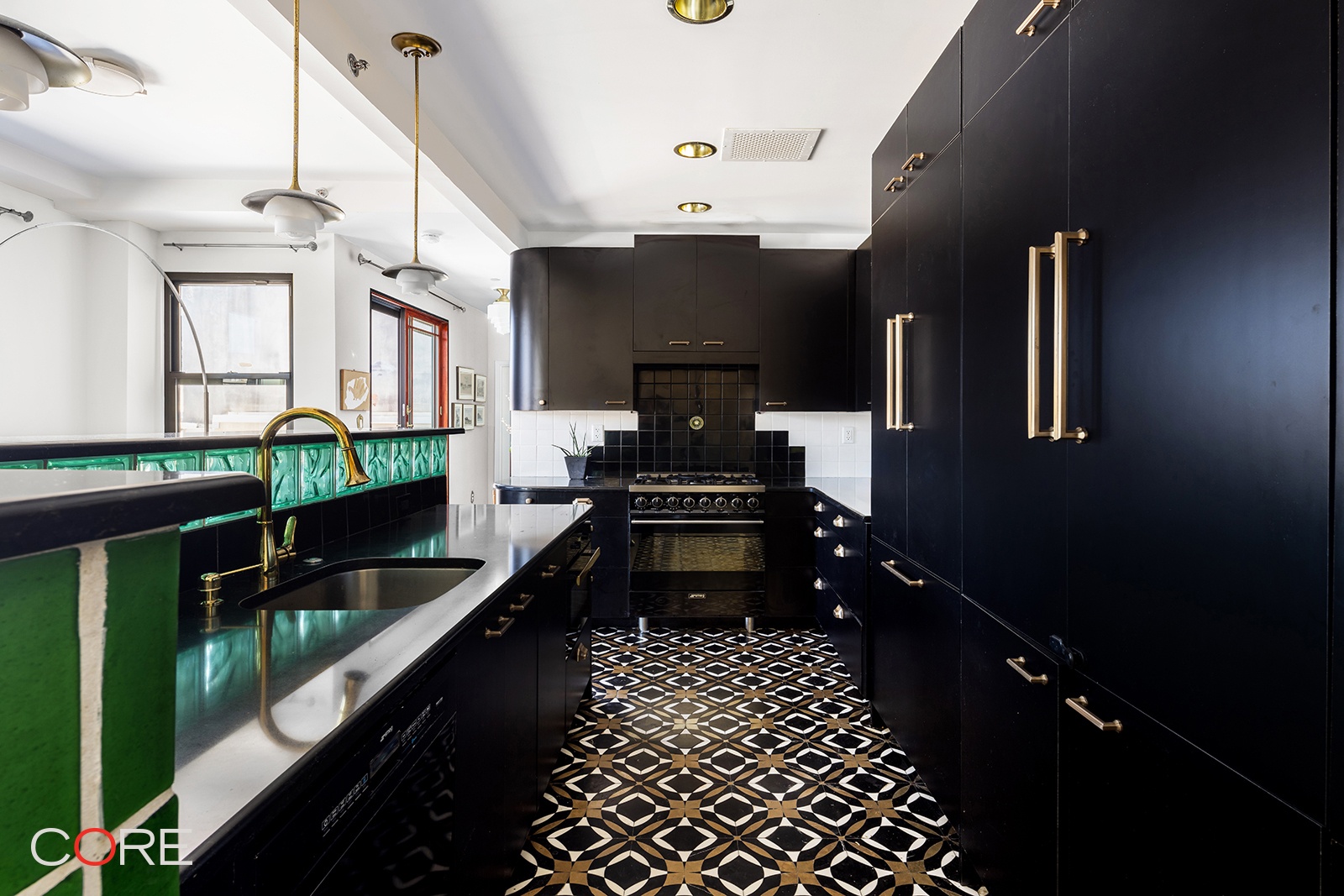 Expansive three-bedroom penthouse boasting two large terraces perfect for relaxation and entertainment. The Art-Deco-inspired renovation of this 1,790 SF condo is both stylish and functional with 9'7" ceilings and great light. The large L-shaped living/dining area has a long wall of windows and sliding doors onto a 550 SF terrace. The centerpiece of this home is the stunning chef's kitchen with Silestone counters, a five-burner SMEG gas range and oven, a Miele combination microwave and convection oven, a SMEG dishwasher, a 36" Bosch refrigerator with icemaker, custom tiles, and a glass brick room divider.