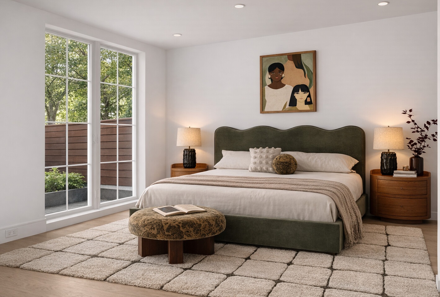 A sun-filled open-plan living and dining room flows naturally to the southern-facing private backyard, creating a bright and inviting space for everyday living and entertaining. The kitchen is thoughtfully designed with clean finishes, a Bertazzoni gas range, and a center island with seating for four, along with generous storage and full-size appliances. White oak flooring throughout the residence adds warmth and continuity.