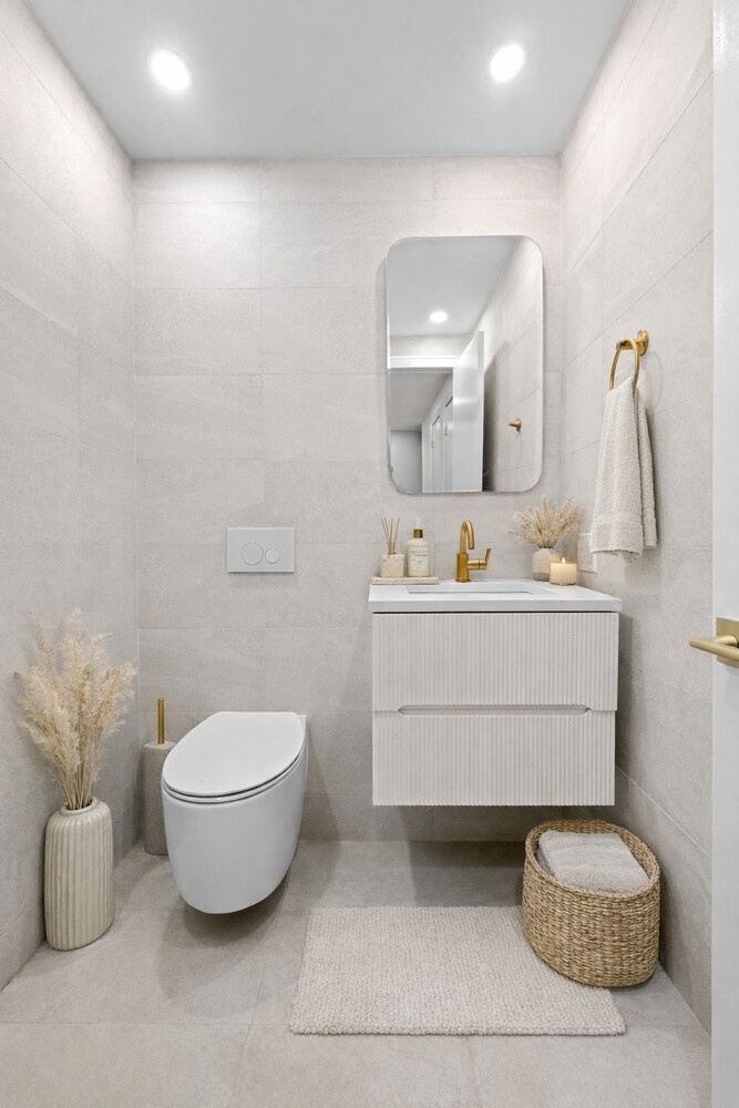 Townhouse B is a spacious two-bedroom, two & 1/2-bathroom duplex with an exceptional 1,426 square feet of interior and 475 square feet of outdoor space. The upper level provides a clear separation between living and private areas, creating a comfortable and well-balanced layout. The versatile lower level can be configured for a guest suite, home office, or media lounge. It includes a dedicated powder room and laundry closet with in-unit washer and dryer. Architectural windows utilize the building lightwell for natural light.