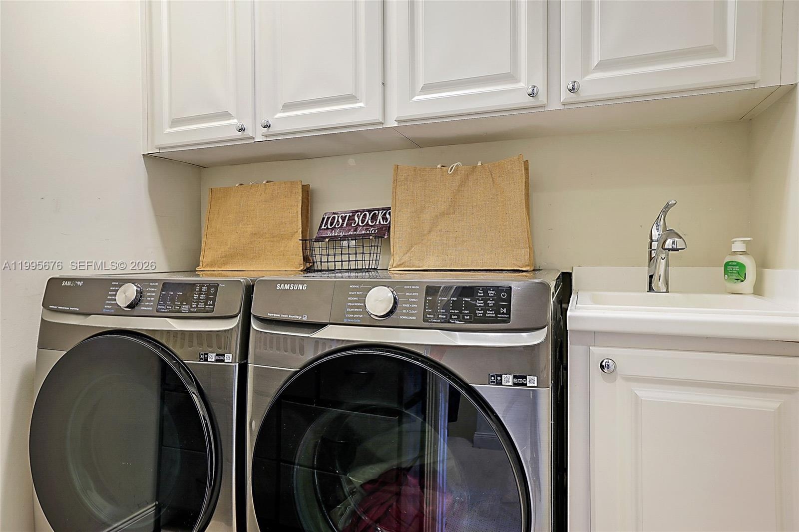 - Laundry room with sink and cabinet storage.