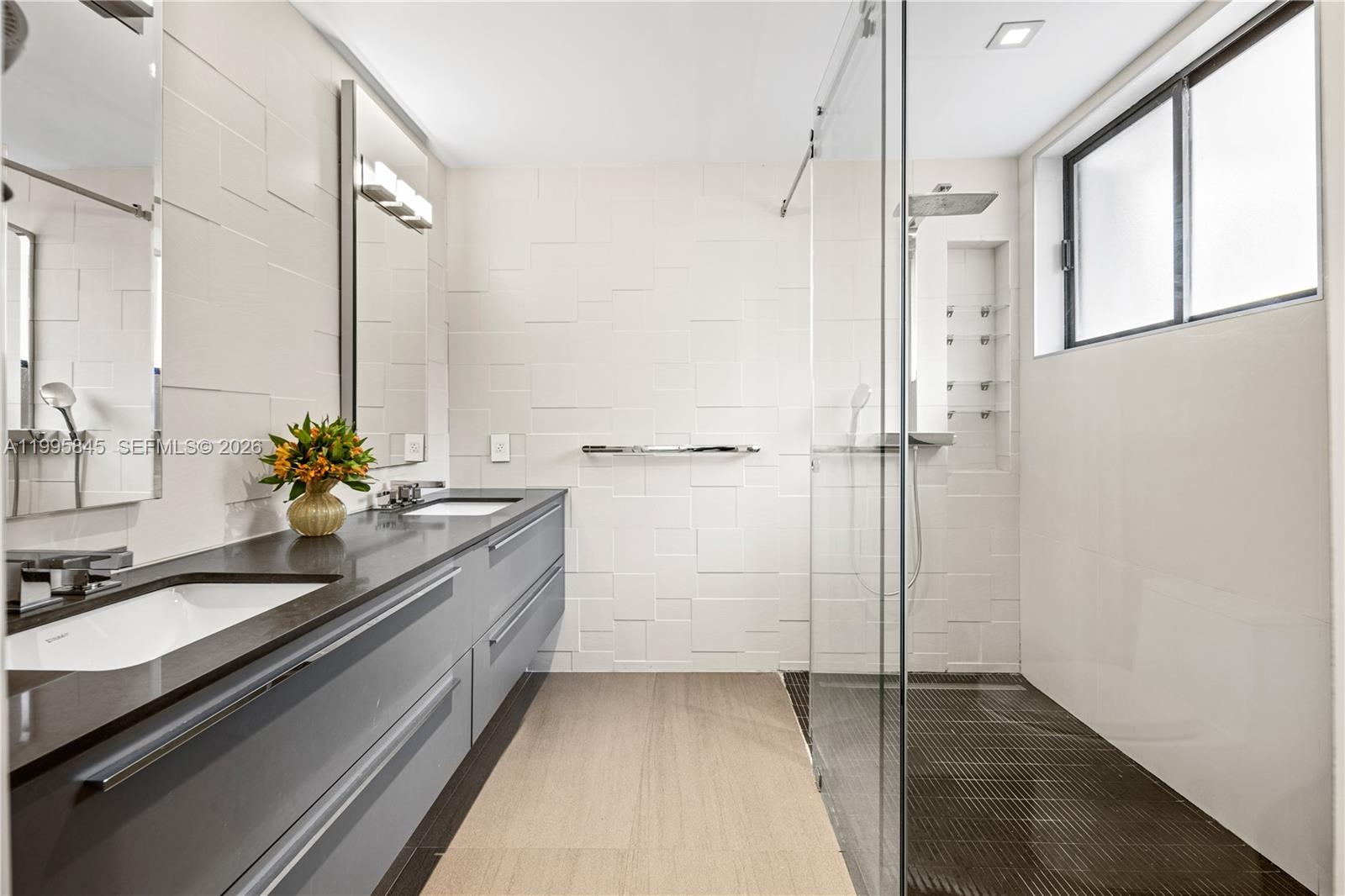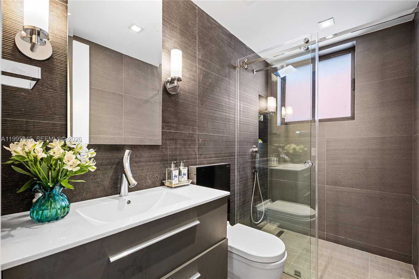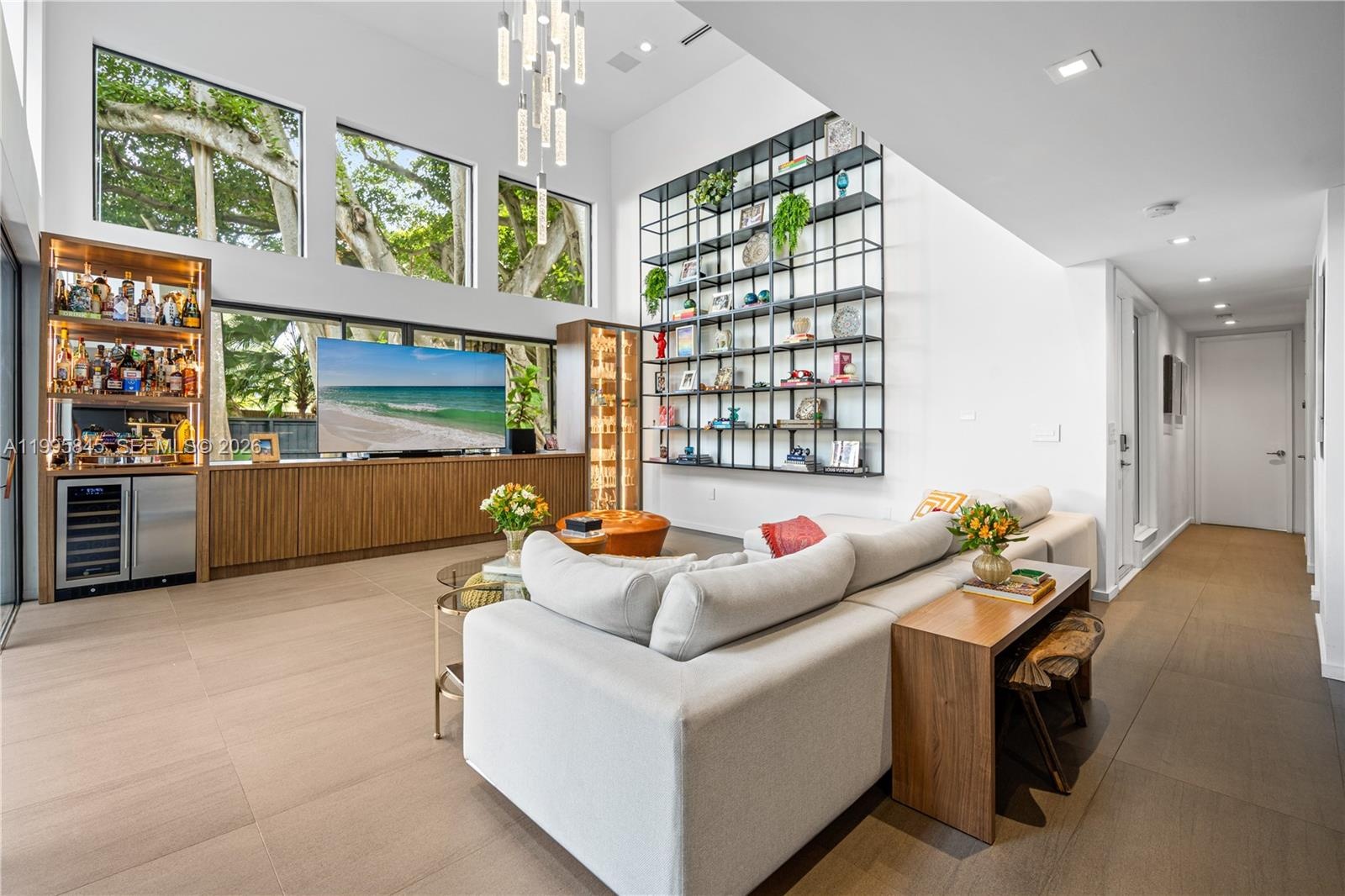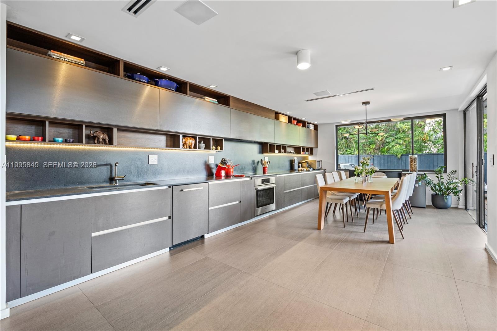The home features a brand-new roof and a dramatic floor-to-ceiling glass wall that fills the interiors with natural light, creating a warm and inviting ambiance. The kitchen flows seamlessly into the dining area and showcases a leather-finished onyx countertop, stainless steel appliances, and soft-close cabinetry.