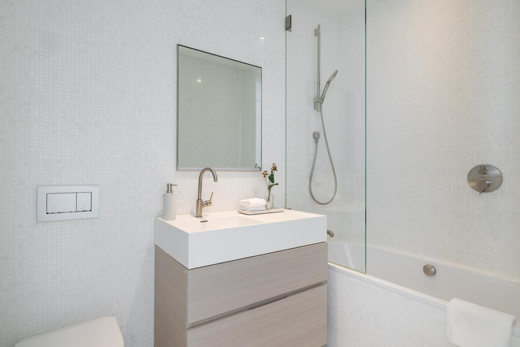 The primary suite boasts open western views overlooking the Hudson River, a marble-clad en suite bath with a Kaldewei soaking tub, radiant heated floors, double vanity, stall shower, a water closet, and generous closet space. Adjacent to the primary suite is an additional bedroom and en suite bath with pocket doors leading into the Great Room, offering the flexibility to create an alternative use, such as an office, den, or library. Completing the mint condition residence is a powder room finished in Scandinavian Larch wood with a floating marble vanity, a large-capacity washer and dryer, triple-pane curtain walls with UVA/UVB protection, motorized shades, 12" wide plank Scandinavian larch wood floors, and private storage.