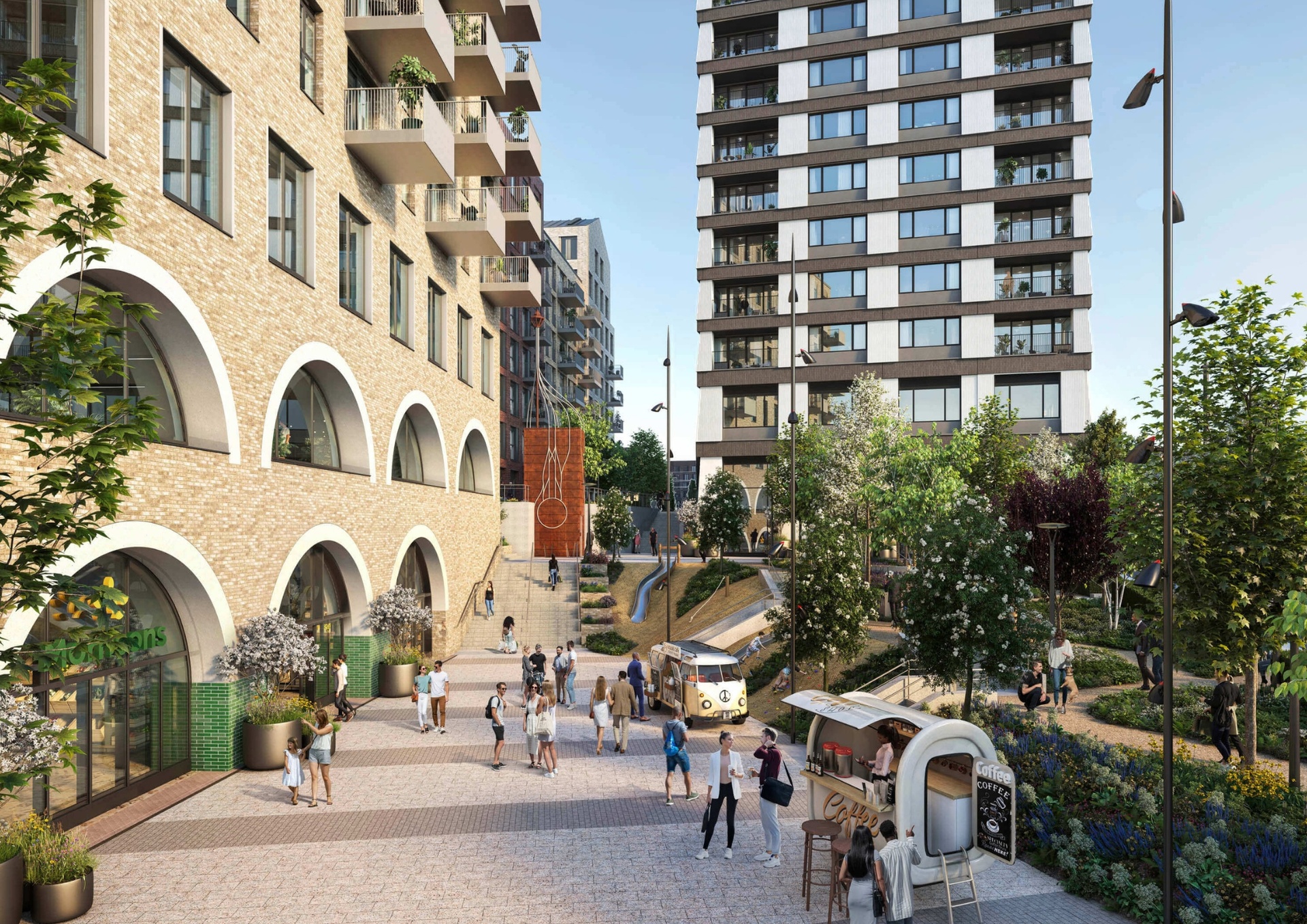 - Landscaped public spaces and vibrant community areas.