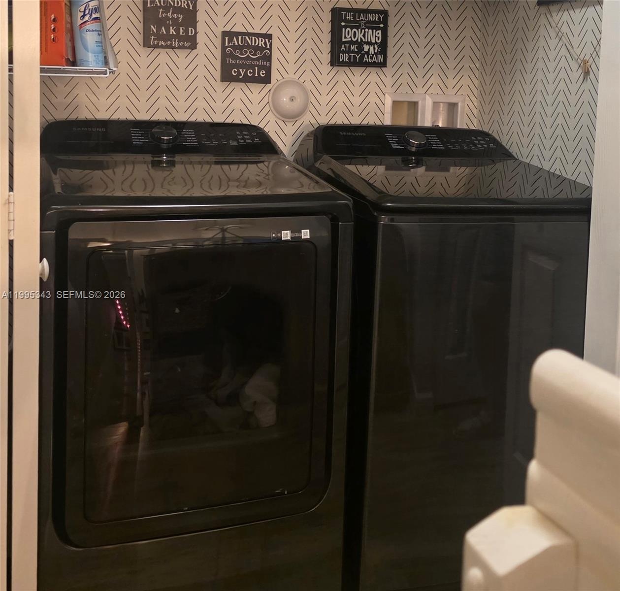 This home features four bedrooms with wood flooring and two full bathrooms upstairs, including a primary suite with a beautiful heart-shaped jacuzzi tub. The downstairs area offers a spacious living and family room with tile flooring, along with a convenient half-bathroom. All appliances are brand new Samsung models and include a warranty.