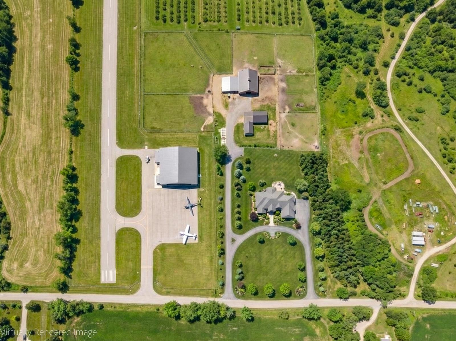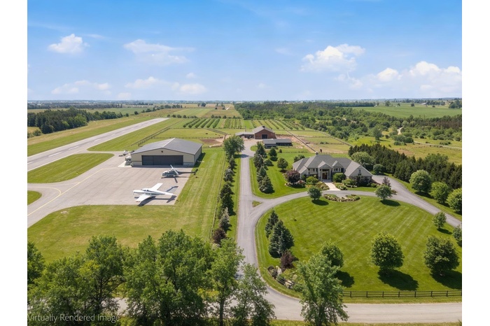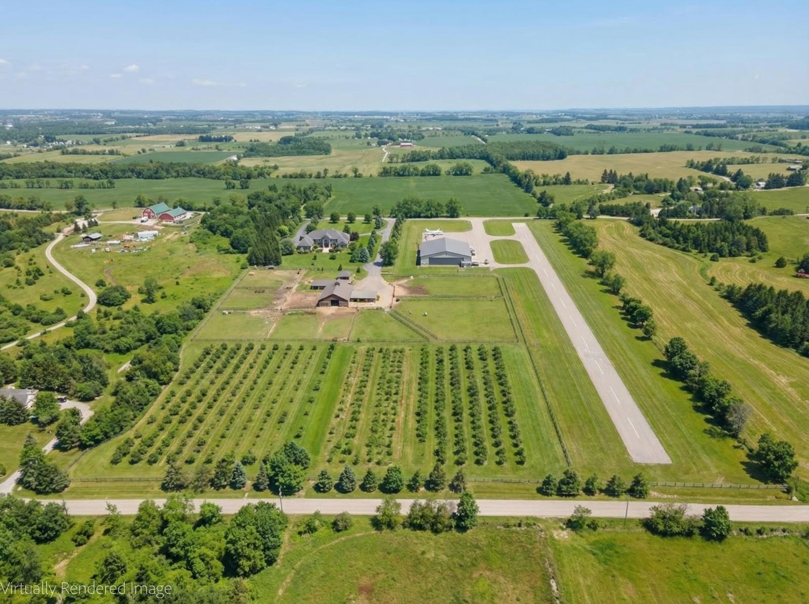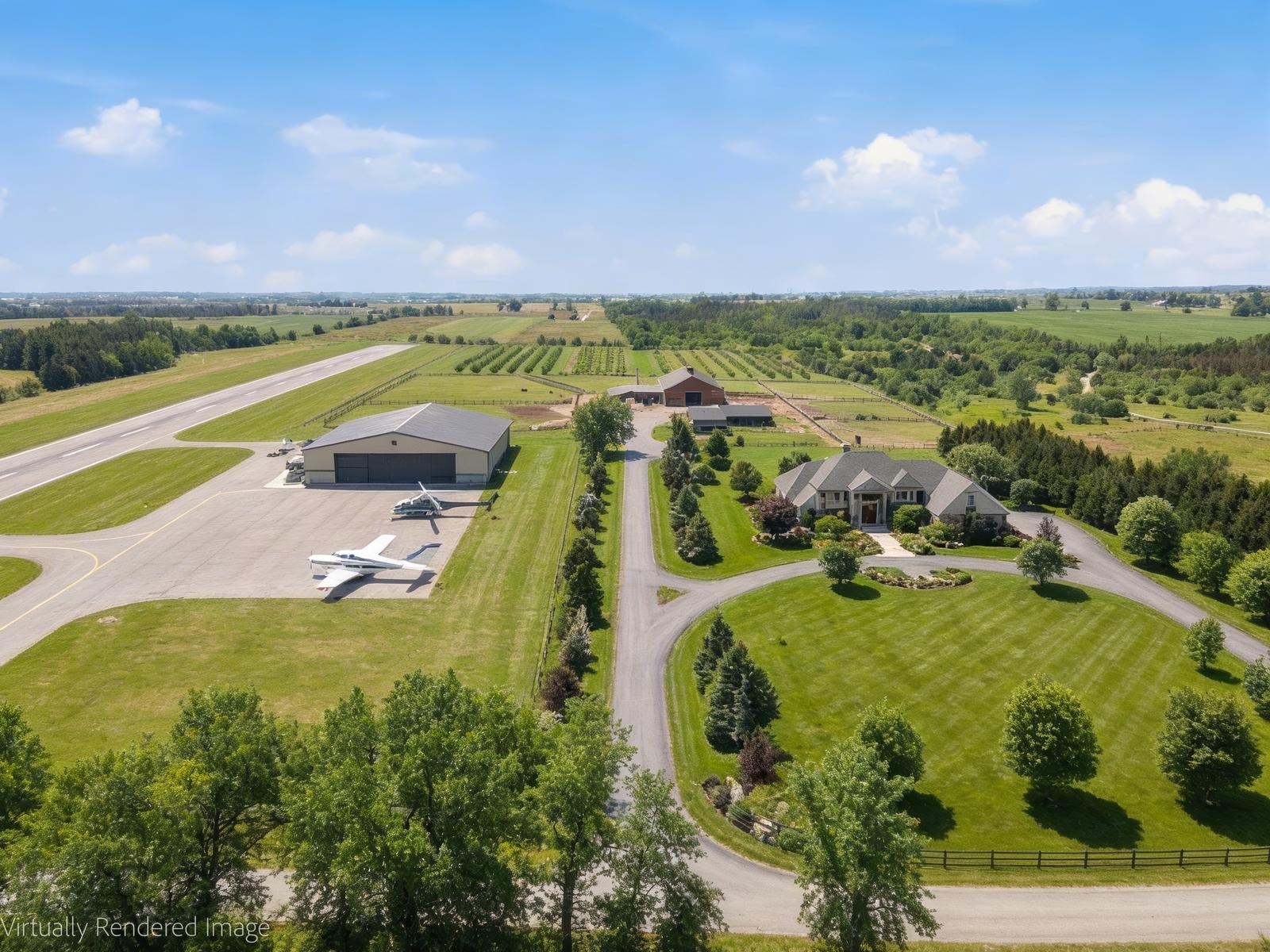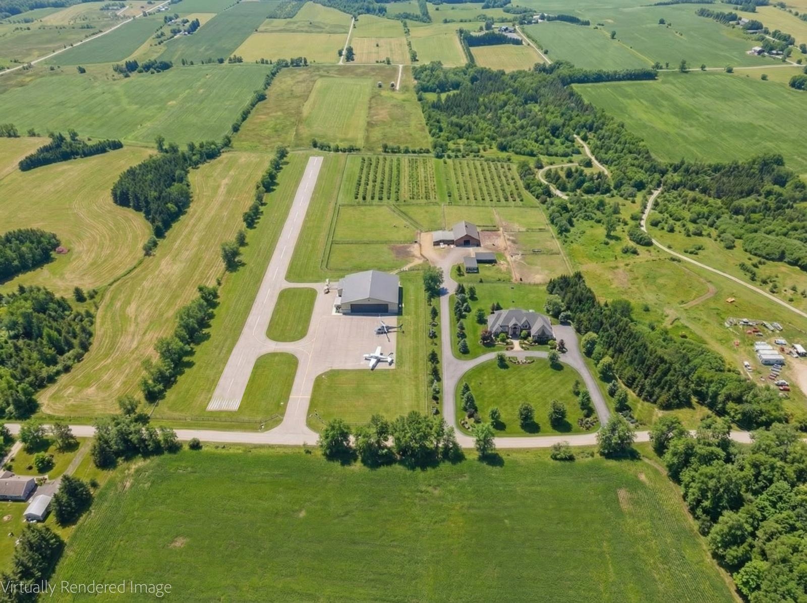 Welcome to this unique 47-acre parcel in South Essa Township, zoned for private aircraft aerodrome use, offering a rare combination of agricultural, commercial, and residential zoning. The property includes approximately 5 acres of commercially zoned land fronting on 8th Line, providing excellent exposure and accessibility for a variety of permitted uses. This expansive property features a traditional Ontario farmhouse with six bedrooms, offering strong potential for multi-tenant use or rental income, along with excellent future redevelopment opportunities. The property is improved with multiple functional outbuildings, including a studio space, as well as a substantial 50' x 80' aircraft hangar with an 18' x 40' office area. A registered aerodrome, the property includes a functional airstrip along with additional shorter runways, making it ideally suited for aviation-related use or businesses requiring private air access. With its flexible zoning and established infrastructure, the property supports a wide range of uses, including agricultural operations, home-based businesses, and specialized commercial applications (subject to municipal approvals). The scale, privacy, commercial frontage, and strategic location create a compelling opportunity for investors, end-users, or those seeking a live/work environment with long-term upside.