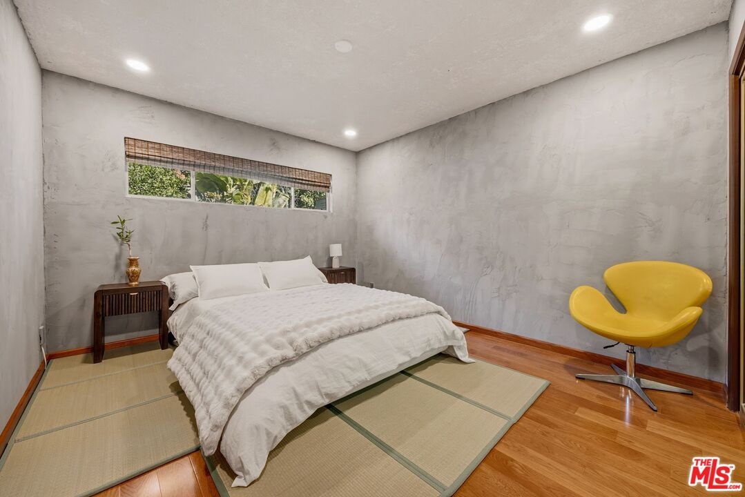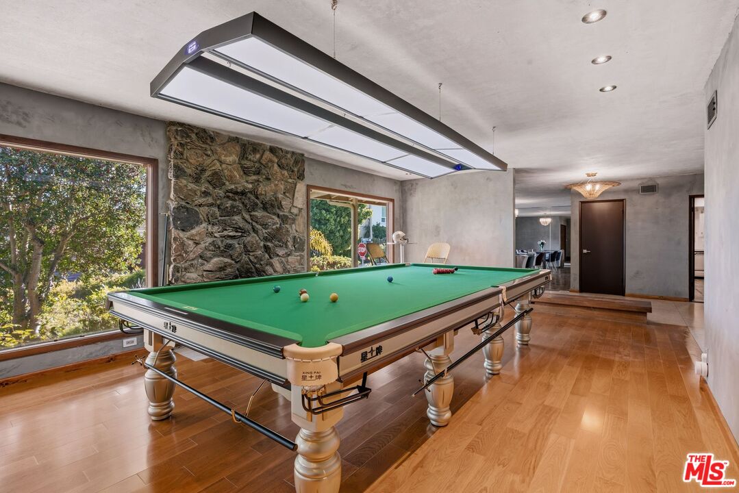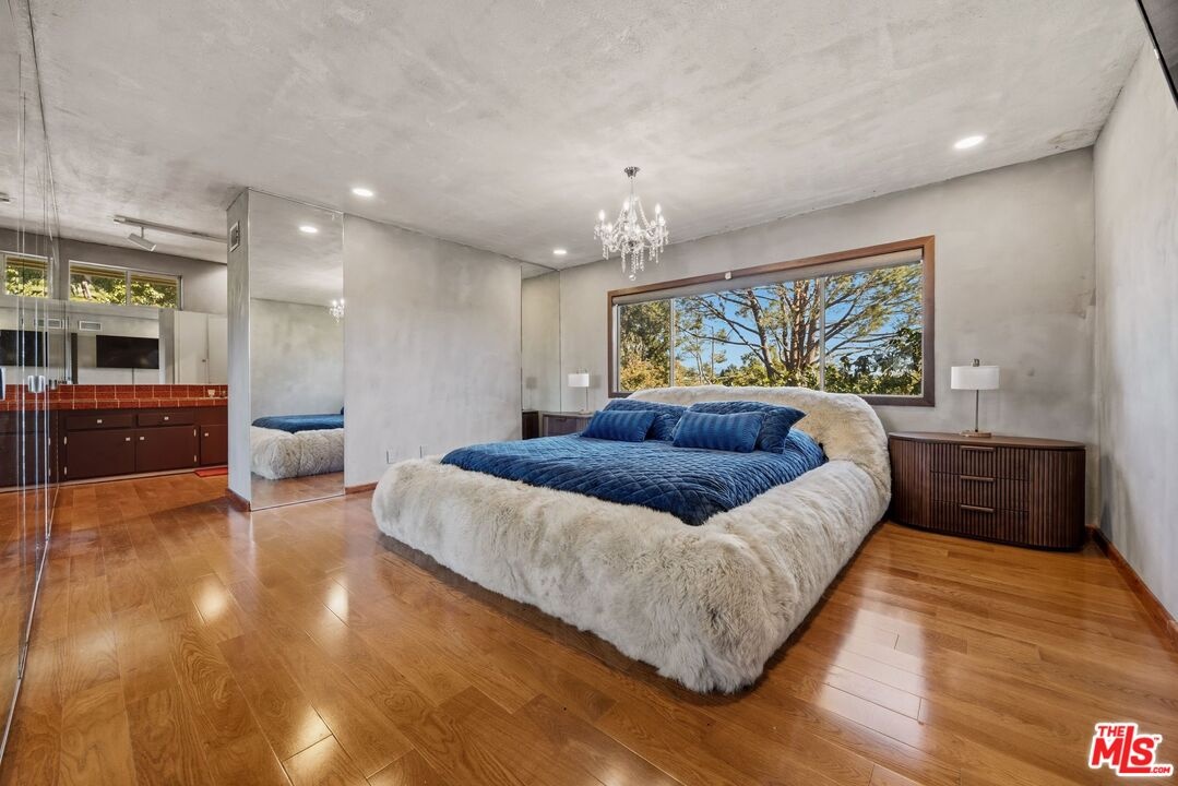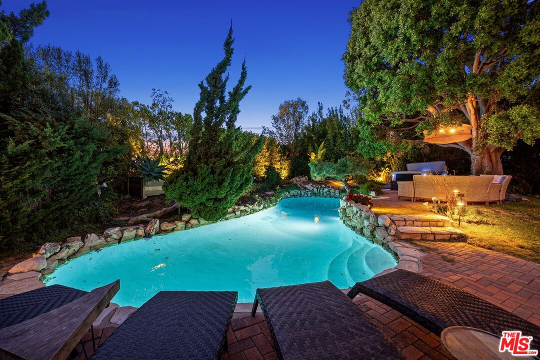 A rare offering in Bel-Air. This 3-bedroom, 3-bath, nearly 3,000 sq. ft. mid-century modern sits on a private corner lot, blending timeless design with effortless California living. Think evenings by the wood-burning fireplace in the sunken living room, or relaxed entertaining that carries easily from one space to the next. The kitchen and dining areas open naturally into both the main living room and the sunken loungeeach anchored by original wood-burning fireplaces that add warmth and character. The rooms feel open and inviting, with natural light throughout and a sense of scale that reflects true mid-century design. The home flows seamlessly outdoors into a quintessential backyard retreat. Generous grounds surround a heated dining patio and BBQ area, along with a more secluded alfresco lounge and spadesigned for both quiet mornings and evening gatherings. At the center, an oversized lagoon-style pool is framed by mature foliage, natural stone, and canopying trees, creating a setting that feels private, organic, and distinctly Bel-Air. Thoughtfully updated with new flooring, electrical, EV charger, HVAC, heated pool, hot tub and more, the home is ready for today while maintaining its architectural integrity. Set on a flat 11,000+ sq. ft. corner lot, it also offers a rare opportunity for expansion, with potential for unobstructed city and downtown views from a future second story.