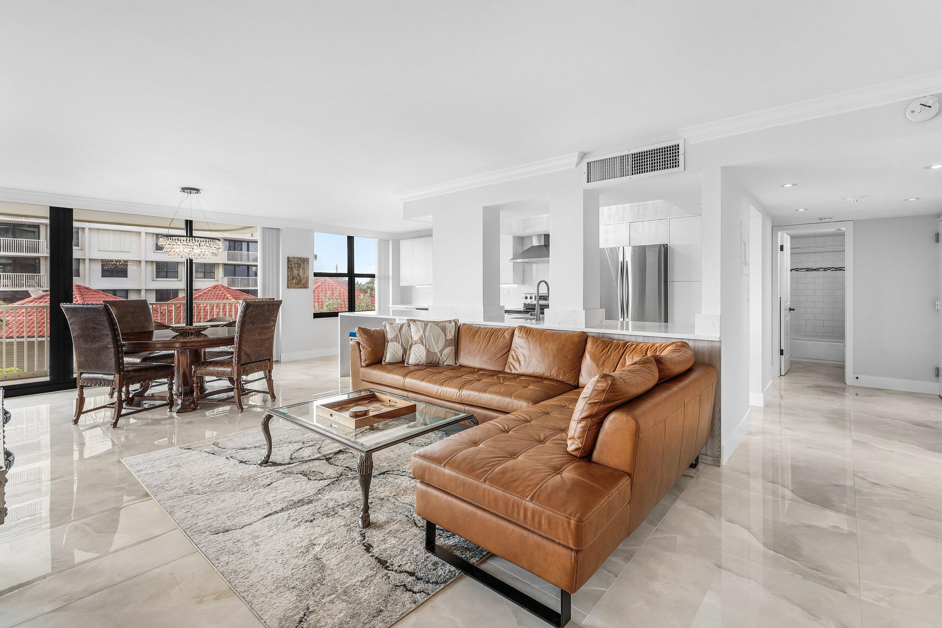 Experience refined coastal living at Residence A1C in Dunes Towers Condo, 5480 N Ocean Drive. This beautifully renovated, fully furnished corner residence is available for seasonal rental and offers exceptional privacy with only four residences per floor. A wraparound balcony showcases sweeping Atlantic Ocean views, while expansive glass fills the home with natural light and ocean breezes. The modern open kitchen features quartz countertops, a waterfall island, stainless steel appliances, and custom cabinetry. Large-format tile flooring and a clean, contemporary coastal palette create an effortless, elegant atmosphere. Generous bedroom suites, two walk-in closets, and seamless indoor-outdoor flow complete the space. Residents enjoy private beach access, pool, fitness center, and concierge-style on-site management—just minutes from John D. MacArthur Beach State Park, the PGA Corridor, and Palm Beach, with Palm Beach International Airport only 20 minutes away.