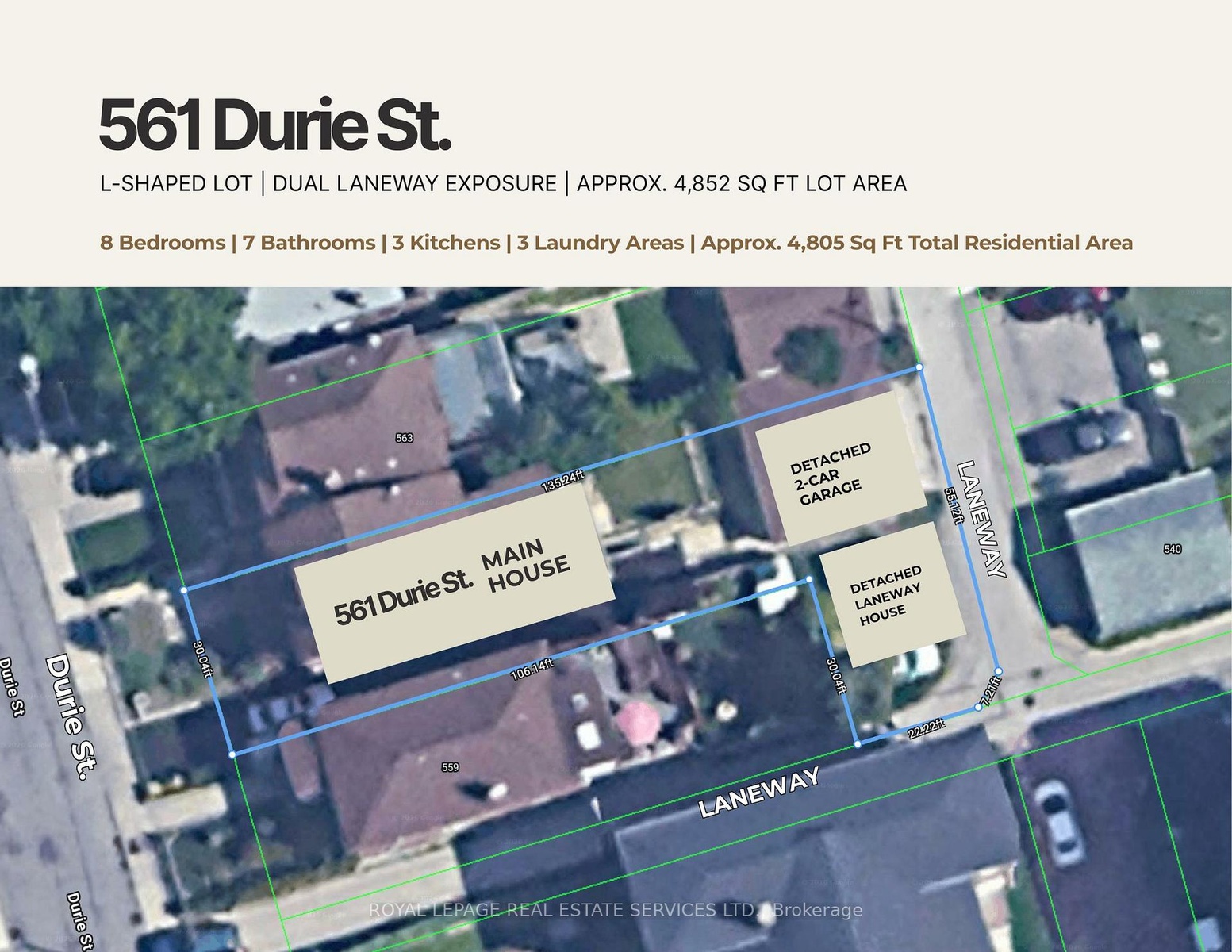 561 Durie is a rare MULTI-STRUCTURE PROPERTY set on an exceptional L-SHAPED LOT with DUAL LANEWAY EXPOSURE. A striking 3-storey main Residence lives like a true detached family home on its own 30 x 135 ft setting, offering 5 bedrooms, 4 baths, approx. 2,829 sf above grade, plus a SEPARATE 1-BEDROOM LOWER-LEVEL SUITE of approx. 1,058 sf, with a DETACHED 2-CAR GARAGE. A DETACHED 2-STOREY, 2-BEDROOM LANEWAY SUITE of approx. 918 sf occupies its own dedicated portion of the site, creating separation, meaningful size backyard, privacy & flexibility that is hard to come by. Every part of this property was built with purpose. The main level unfolds from a front Living Room framed by a full wall of striking custom millwork and two fireplaces, into a substantial central Kitchen and integrated Dining Area, and extends into an expansive rear Family Room where large glazing and a walkout to the yard bring in light and create a strong connection to the outdoors. The second level is anchored by a beautiful Primary Retreat with approx. 10.5-ft ceilings, built-ins, Dressing Space, and a finely finished Ensuite, along with Two Additional Bedrooms connected by a Jack-and-Jill Bath. The third level offers a Lounge that feels like its own private world, creating a separate upper zone with 2 Additional Bedrooms and a Full Bath. A glass-railed staircase and multiple skylights draw natural light through the home. This is a property that supports connected, MULTI-GENERATIONAL LIVING, LIVE-WORK USE, or LONG-TERM INCOME POTENTIAL without compromise. In total, the property offers: 8 BEDROOMS, 7 BATHROOMS, 3 KITCHENS, 3 LAUNDRY AREAS, and approx. 4,805 sf of LIVING SPACE. You need to experience 561 Durie in person to understand its full scale. Located in one of the West End's most established neighbourhoods, close to Village shops, cafes & amenities, surrounded by parks, green spaces, and top-rated schools, with easy TTC access and quick routes to downtown, Pearson, and UP Express.