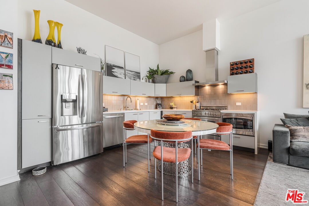Welcome to the iconic Lofts at Cherokee Studios, this sophisticated two-bedroom, two-bath residence blends modern luxury with a storied entertainment legacy. The historic property occupies the former sites of Cherokee Recording Studios and MGM Studios, where legends such as Frank Sinatra, David Bowie, and Michael Jackson once recorded. Designed by acclaimed architects Pugh + Scarpa, the building represents one of the first environmentally conscious developments to achieve Platinum LEED certification, incorporating features such as solar panels, passive cooling design, drought-resistant landscaping, and a communal rooftop deck. Positioned as a rare single-level corner residence and one of only two of its kind, the east-facing home showcases an airy, open-concept layout framed by expansive glass walls that open to a generous private terrace with treetop and Hollywood Hills vistas. Approximately 11-foot ceilings further amplify the volume of the living and sleeping spaces, while warm wood flooring extends throughout. The kitchen is appointed with premium stainless-steel appliances, including a Bertazzoni range along with newer LG refrigerator and dishwasher. The primary suite includes a spacious custom walk-in closet and an elegant ensuite bath, complemented by additional spa-inspired bathrooms and automated window treatments. A private balcony with dedicated storage offers added functionality and a peaceful outdoor escape. Residents also enjoy access to a rooftop deck with sweeping 360-degree views, two separate subterranean parking spaces featuring a newly installed electric vehicle charger, and in-unit laundry. Ideally located with a Walk Score of 94, the home sits close to Melrose Avenue, Whole Foods, and an array of notable dining and entertainment options, presenting a rare opportunity to own a sustainable, design-forward loft in the heart of Hollywood with just about anything you could look for within walking distance.