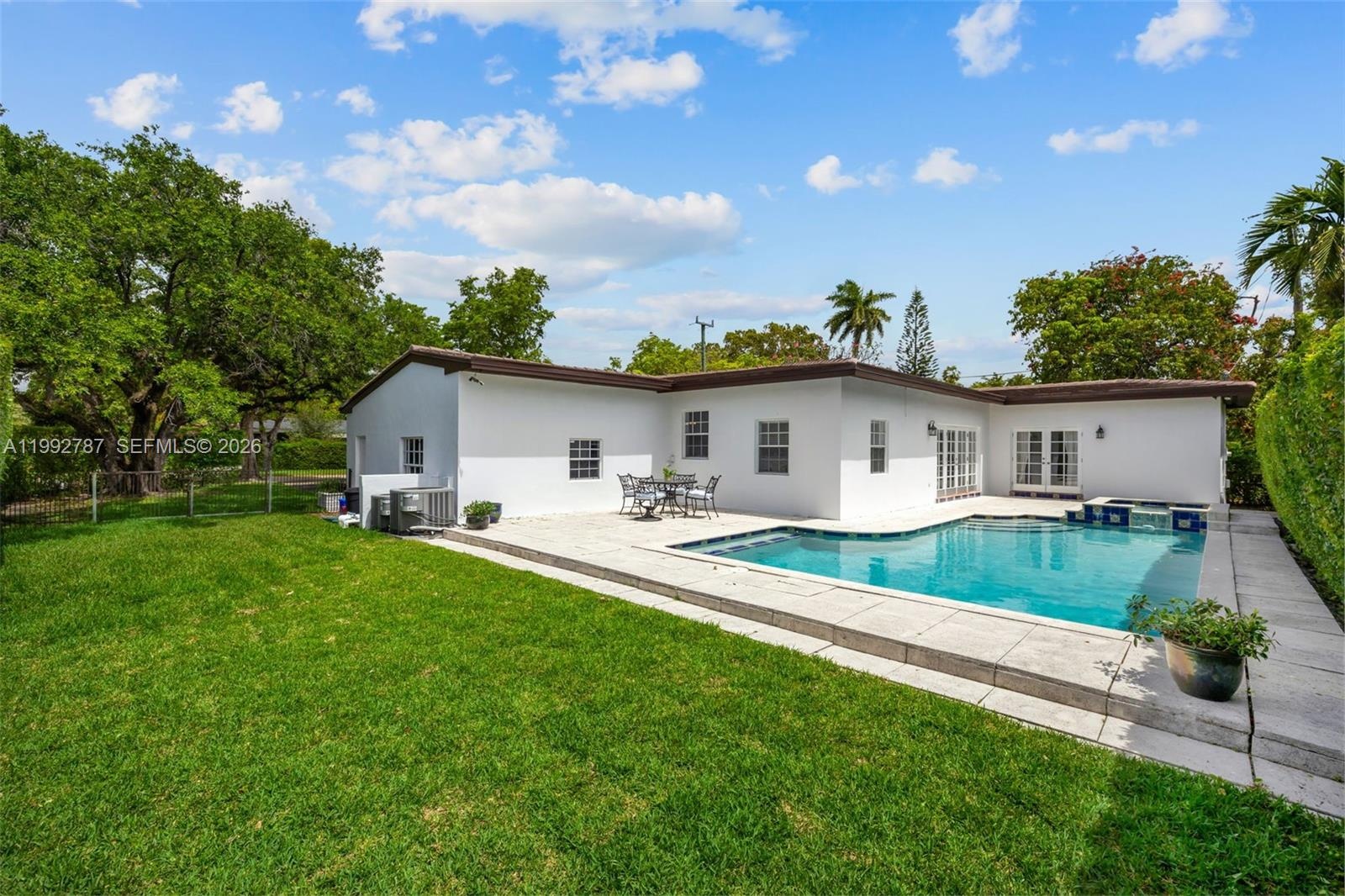 [A Miami Signature Home] There’s a softness to this home—a glow reminiscent of a Renoir painting. From the moment you arrive, this one story jewel radiates warmth and understated elegance. Resting on an 11,025 SF corner lot, its lofty ceilings and open layout invite light to dance through wide windows and doors, blurring the line between indoors and the serene back patio. A new roof and silky hardwood floors elevate every room, while the expansive primary suite frames enchanting views of the sparkling pool, creating a retreat that feels almost dreamlike. The triple split floor plan ensures harmony between privacy and convenience, and the two car garage with loft storage adds thoughtful functionality. Surrounded by lush hedging, the property becomes a peaceful sanctuary—perfect for intimate moments or lively gatherings. Ideally located near excellent schools, beloved shops, and dining, this home is nothing short of magical.