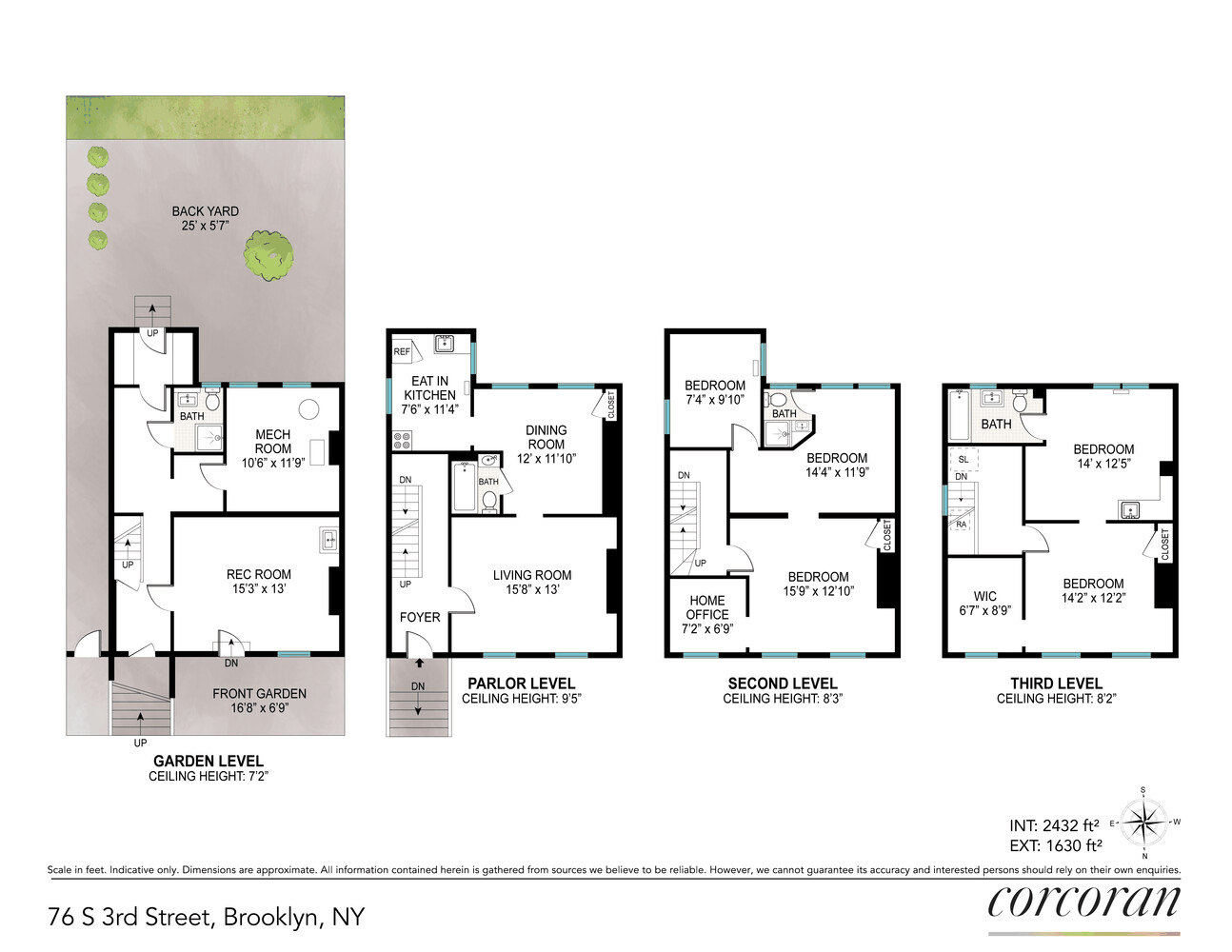 The existing building spans approximately 2,432 square feet across 3.5 stories on a 2,250 square foot lot. The current layout includes a garden level with a recreation room, bathroom, mechanical room, and access to both a front garden and private rear yard; a parlor level with living room, dining room, eat-in kitchen, and bathroom; a second floor with three bedrooms, a home office, and a full bathroom; and a third floor with two additional bedrooms, a walk-in closet, and another bathroom. This generous footprint offers the kind of size and versatility that is increasingly difficult to find in Williamsburg.