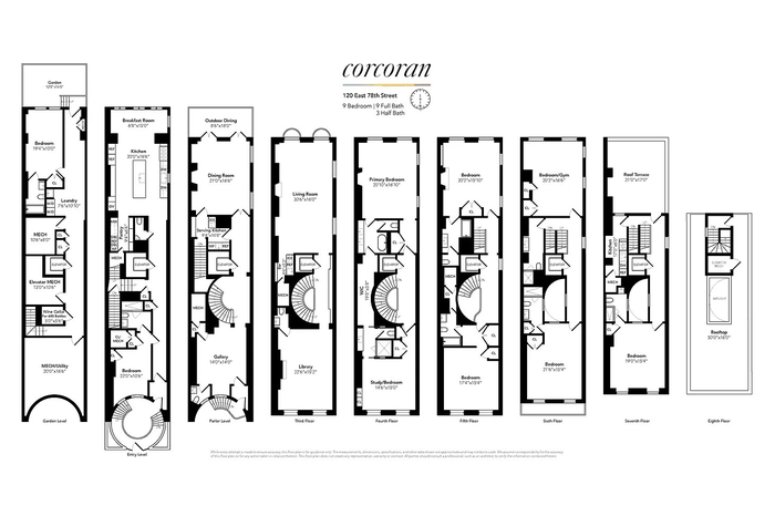 The townhouse totaling over 12,000 square feet features 9 bedrooms and 12 bathrooms, all outfitted with radiant heat floors, ensure comfort in every corner. The property's architectural integrity is highlighted by its magnificent scale and grandeur, with many principal rooms enjoying double exposures. Outdoor spaces are thoughtfully integrated, including a private garden off the first level, charming terraces off the dining room and 7th floor, and a sun-drenched roof deck. A chef's dream, the large kitchen features custom cabinetry, top-of-the-line stainless appliances, and a spacious dining area, making it perfect for both everyday living and grand entertaining. This property is ideal for an end user and/or investment property. Owner/Listing Agent.