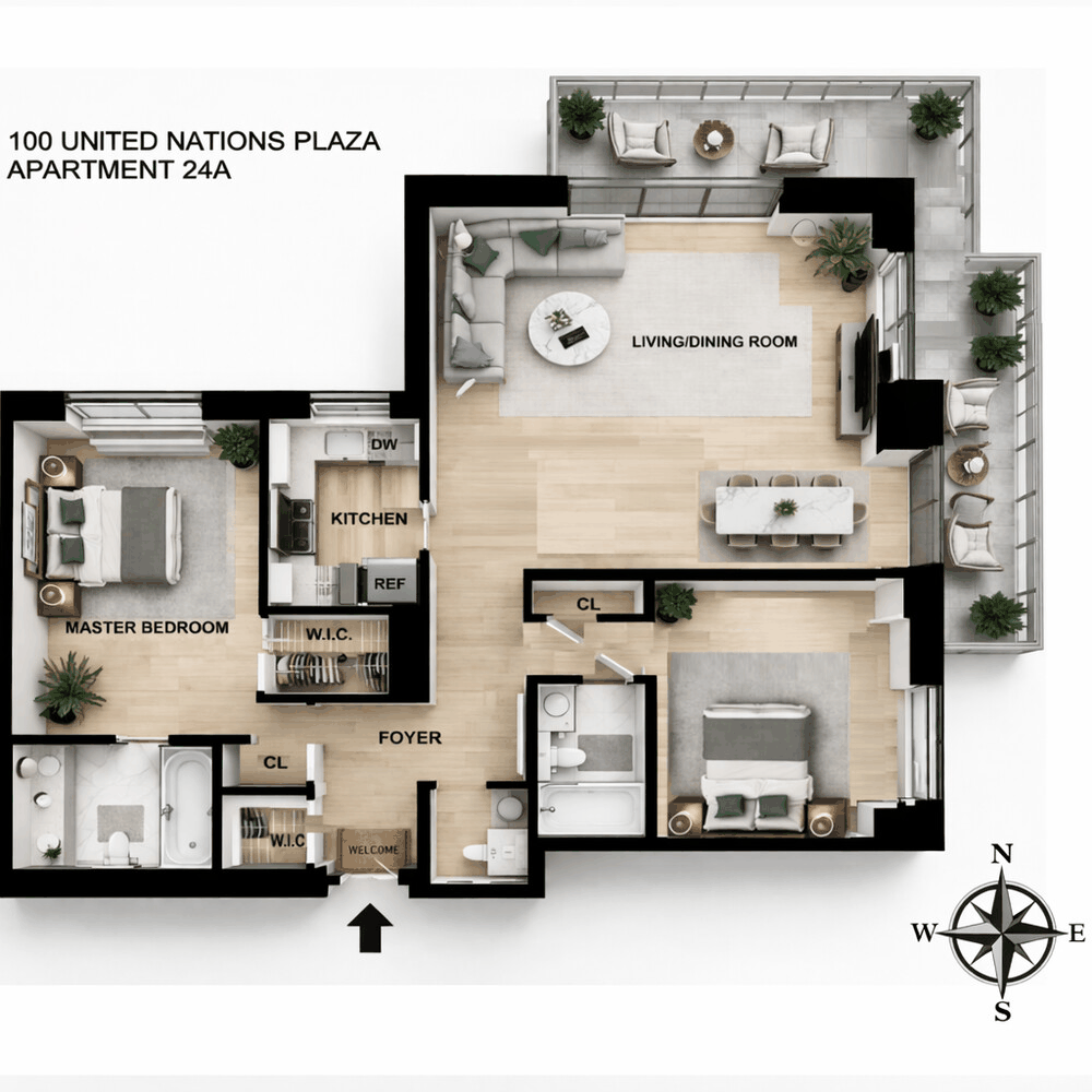 Exceptional value awaits in this beautifully proportioned 2-bedroom, 2.5-bathroom corner residence with a private wraparound balcony at 100 United Nations Plaza-one of Midtown East's premier white-glove condominiums.