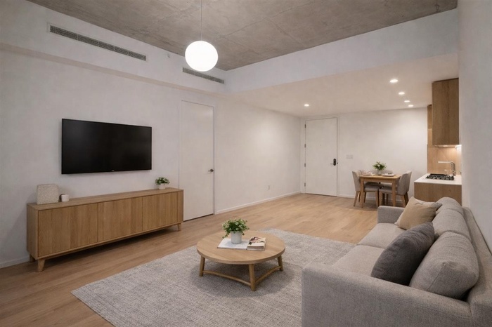 The meticulously designed details throughout this 1 bedroom home at 98 Front has been carefully curated to enhance the comfort and luxury of your living experience. Natural light pours in from oversized insulated sound-attenuated 8 feet 8 inches windows by ALUMIL, and the 5 inches White Oak floors further illuminate the space. High ceilings are made of polished concrete complete with junction boxes for easy lighting fixture installation. These one bedroom floor plans are the height of space-efficient living, while still providing plenty of room to stretch out, entertain and unwind. The imported Italian kitchens are paneled in blonde wood to create an organic, clean palate complimented by modern white Corian countertops and backsplashes that are both sleek and durable.