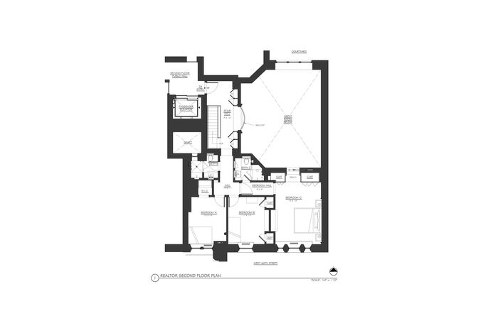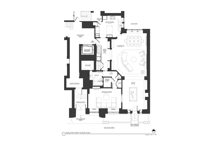 Beyond the great room, an office gallery with custom cabinetry and a decorative fireplace does double duty as both a work space for two and a recreation space for many. Off of the office, a dedicated media/den has the versatility to also be a guest room (fourth bedroom) with a built-in murphy bed. The first floor is complete with three closets, one of which is a large walk-in closet, and a luxurious full bath with tiles from Ann Sacks, cabinetry cabinets, and heated floors.