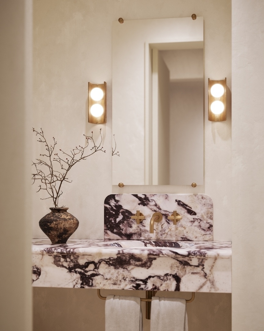 The powder room continues the home’s refined design with a honed Breccia Capria marble vanity and backsplash, custom lighting by Brent Buck Architects, vintage-brass fixtures, and a wall-mounted dual-flush toilet.