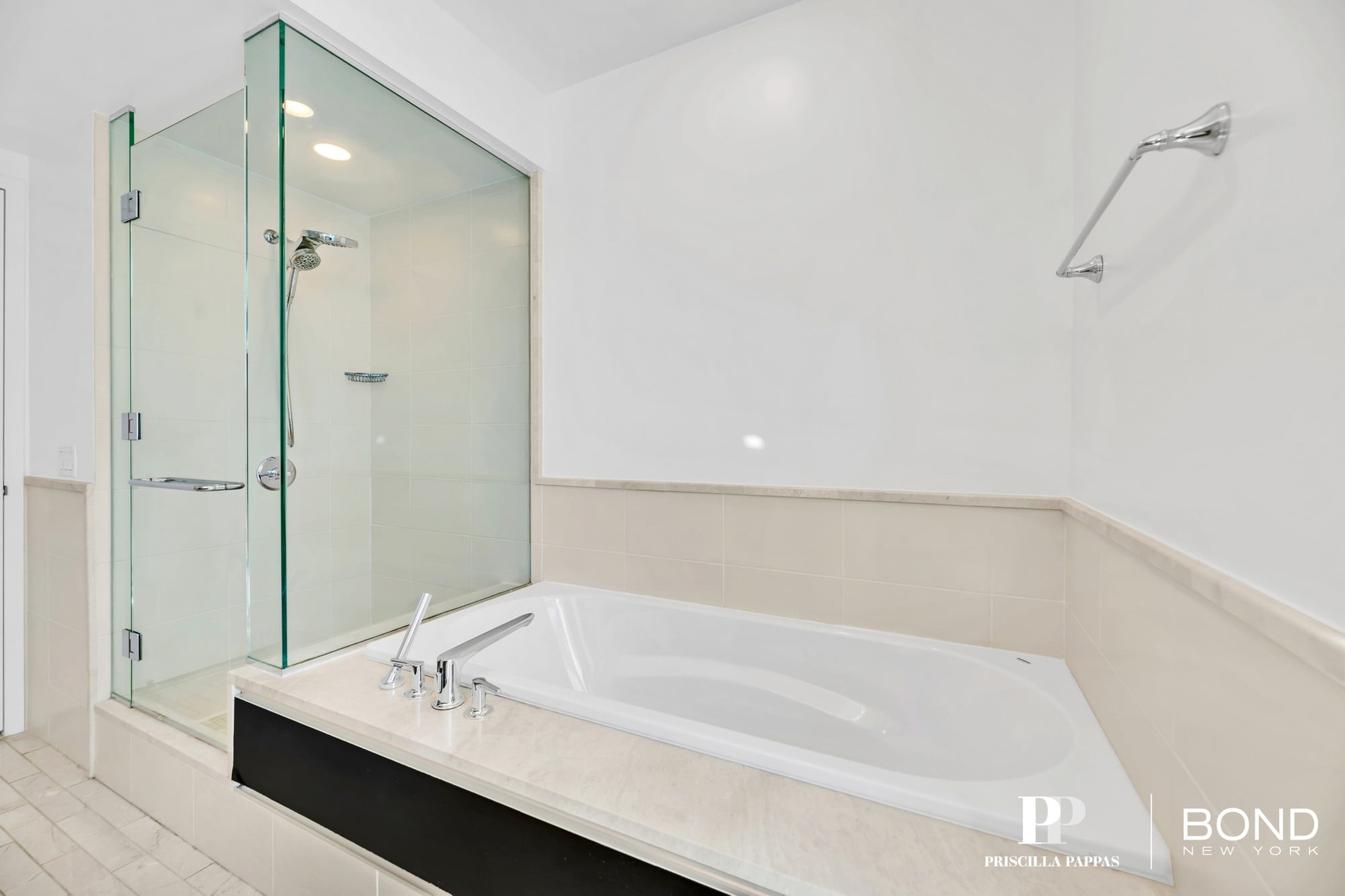 The corner primary suite enjoys both eastern and southern exposures and offers exceptional storage with four closets, including a spacious walk-in with custom built-ins. The en-suite marble bathroom is finished with Waterworks fixtures and features a soaking tub and separate glass-enclosed shower. The secondary bedroom is equally refined, with bright southern light and its own well-appointed en-suite bathroom.