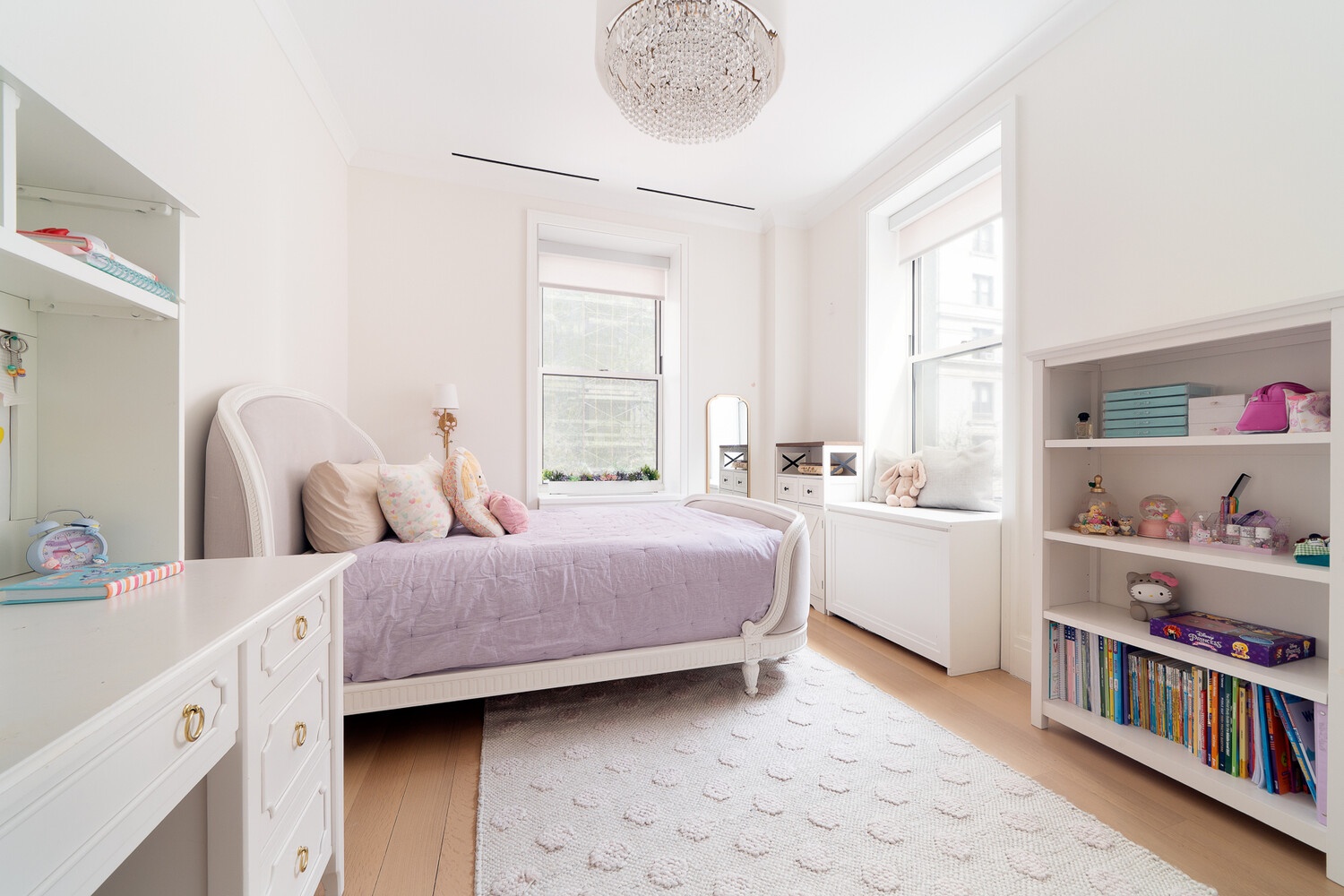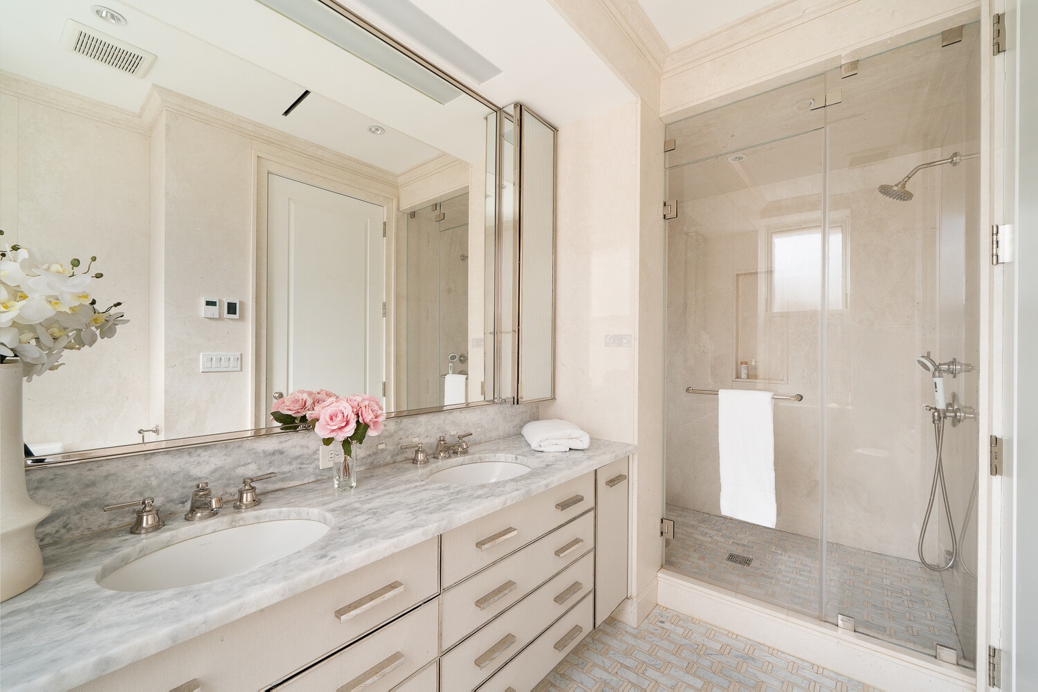 The bedroom wing is separate from the entertaining areas, and the primary suite includes a spacious hotel style bathroom with waterfall shower, a heated floor, a double vanity and Waterworks fixtures. A dressing room includes multiple walls of storage for clothing and personal items. Two additional well-proportioned bedrooms are spacious enough for queen beds and have sizeable closets and cozy window seats.