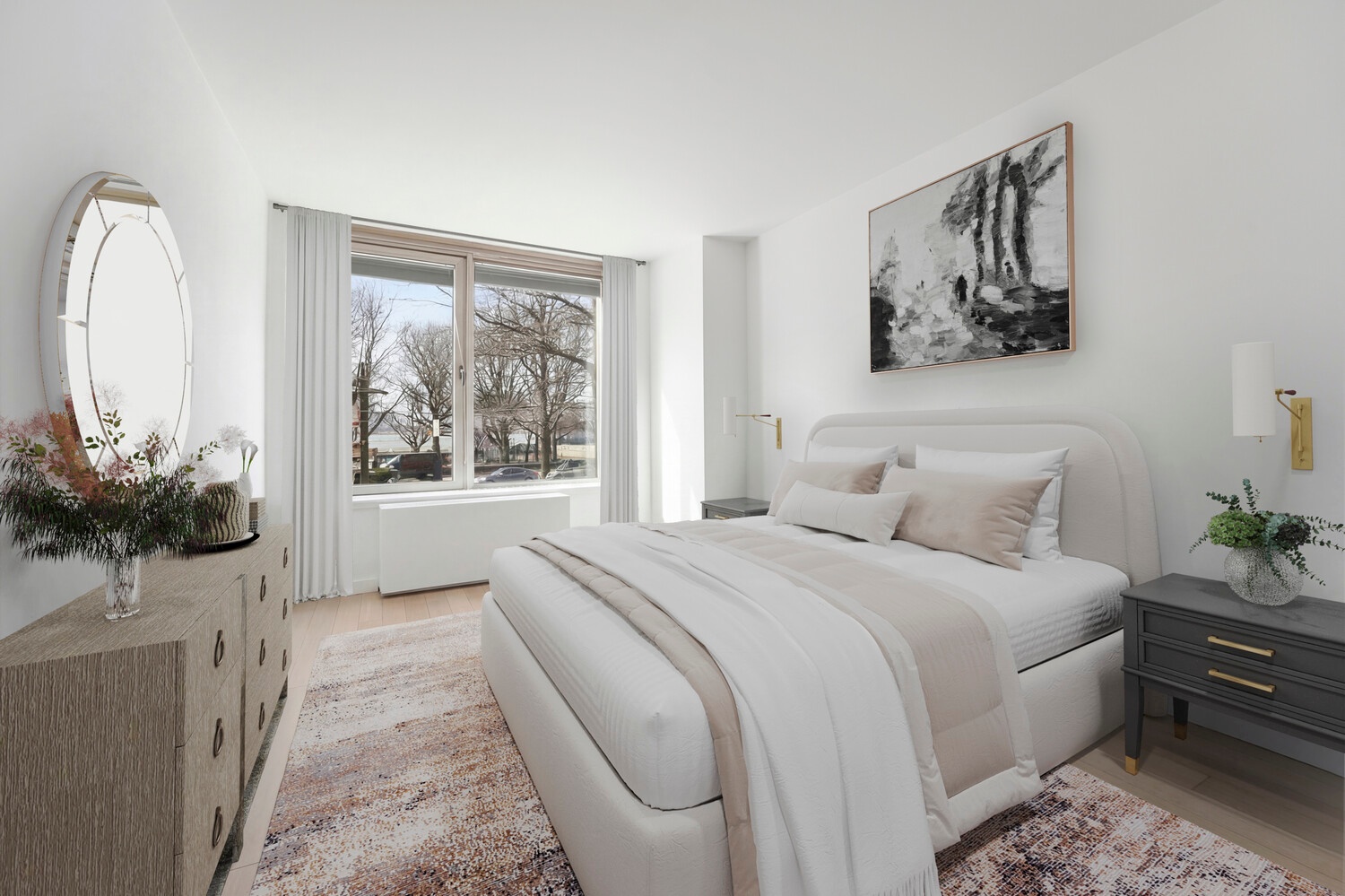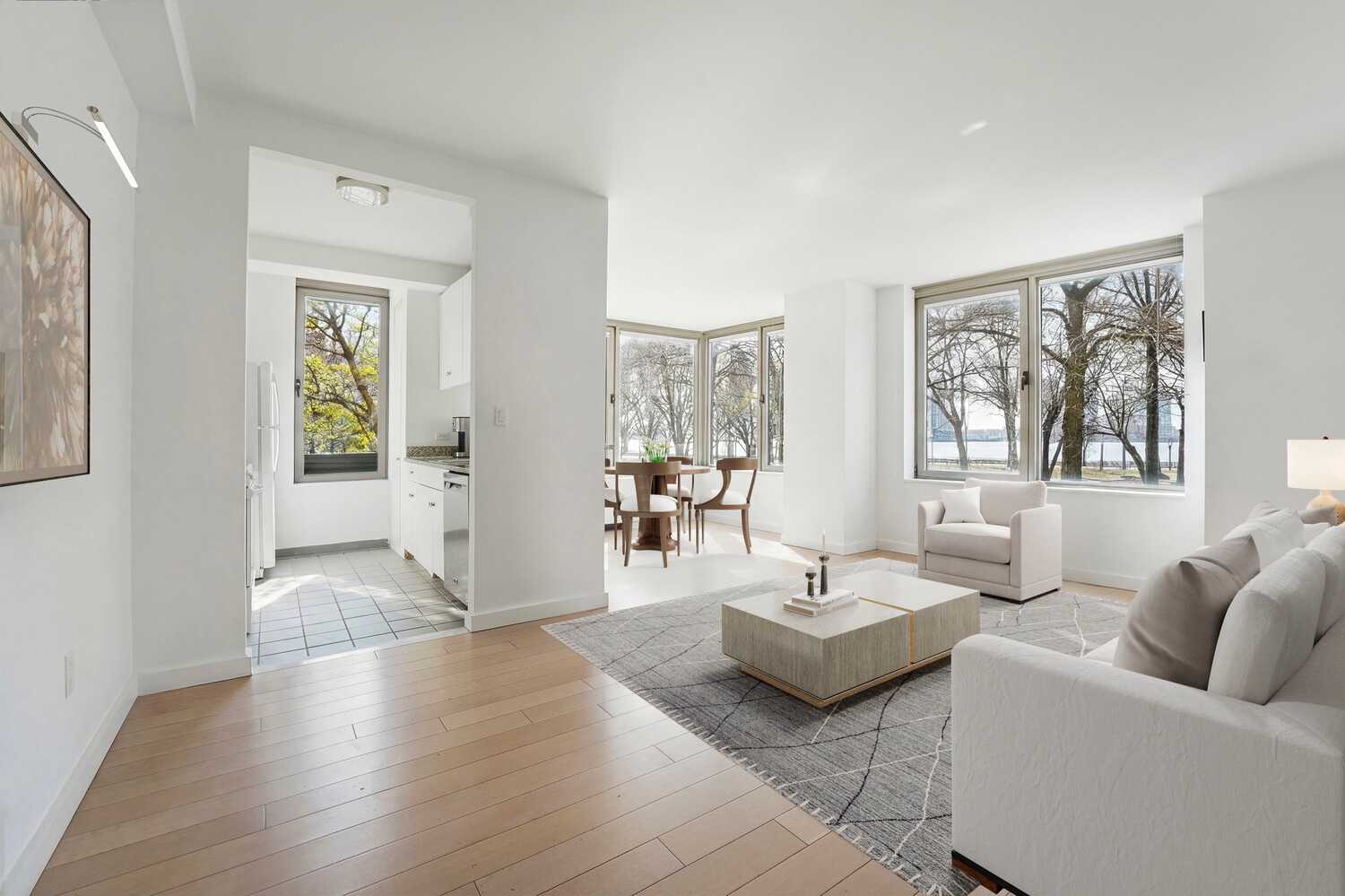 Enjoy beautiful southwest-facing views of Rockefeller Park and the Hudson River from six windows in the oversized living room, creating a bright and inviting space perfect for both relaxing and entertaining. White oak flooring runs seamlessly throughout the home, adding warmth and elegance.