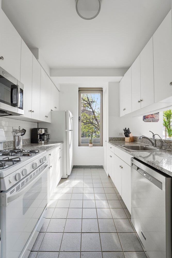A light-filled, pass-through kitchen is ideal for everyday living and entertaining alike, featuring southern exposure, an operable window, and exceptional storage.