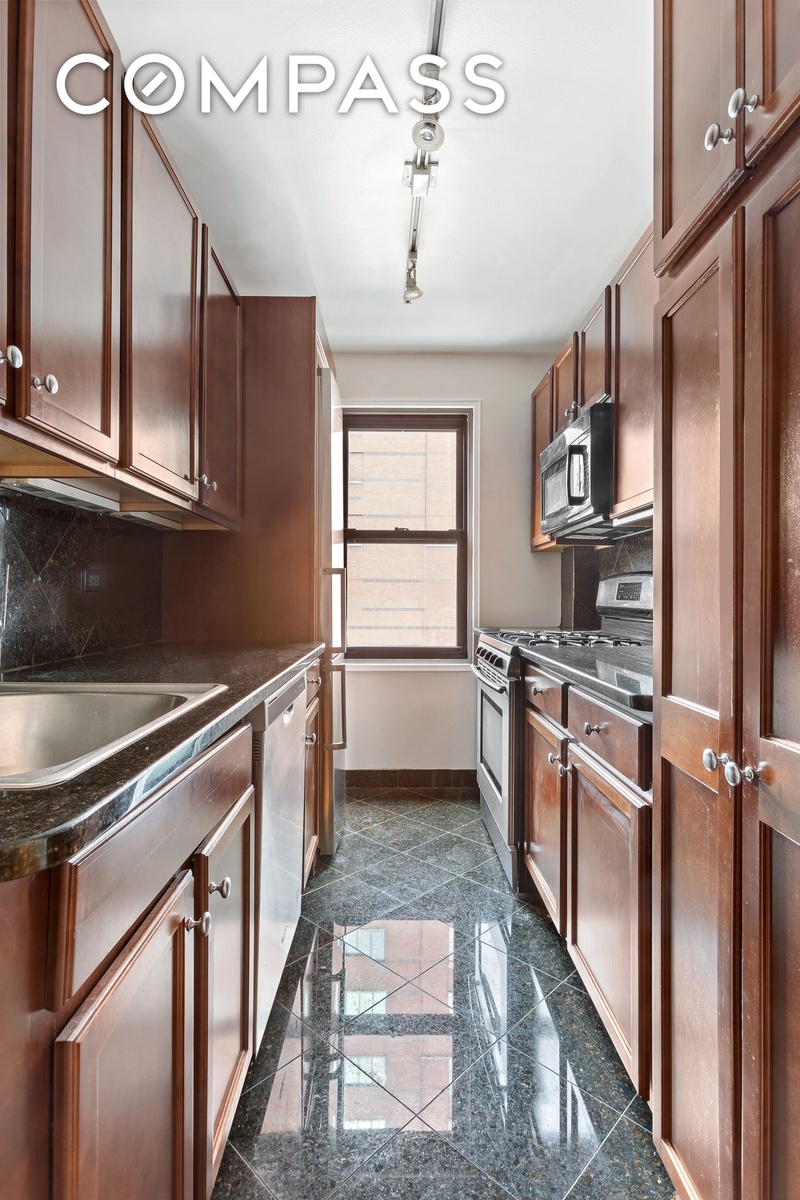 Bathed in streaming sunlight from its western exposures, the apartment showcases wide-open city views. The expansive living area, stretching nearly 31 feet in length, creates a dramatic and flexible setting for both everyday living and entertaining. A large, separate dining area further enhances the apartment’s impressive scale. The windowed kitchen is well-appointed with stainless steel appliances, granite countertops, and abundant cabinetry, ideally positioned adjacent to the dining area for seamless flow. Both bedrooms are exceptionally large - another defining feature of the B line - and are set apart from the main living area, offering quiet, comfortable retreats with excellent closet space. The primary bedroom features double exposures along with an en-suite bath, while a second full bathroom serves the home, both in excellent condition.