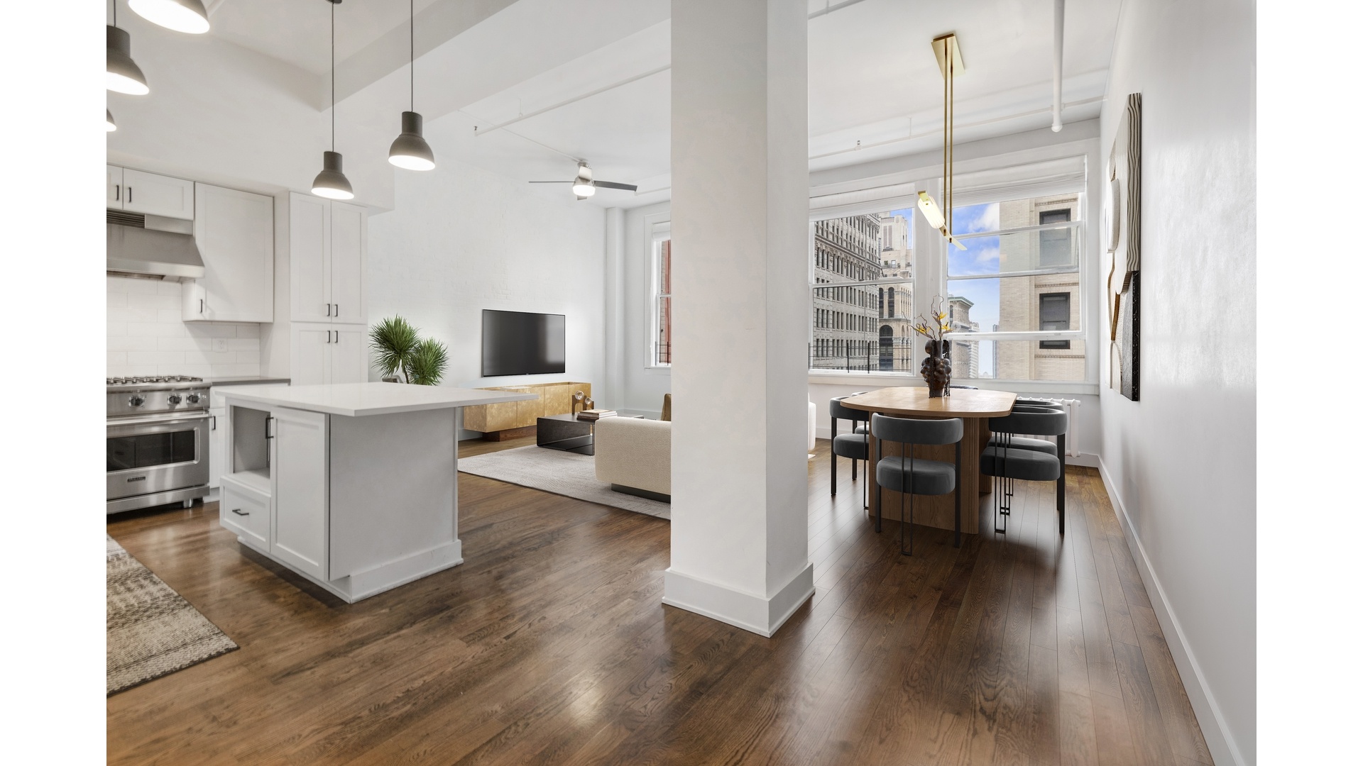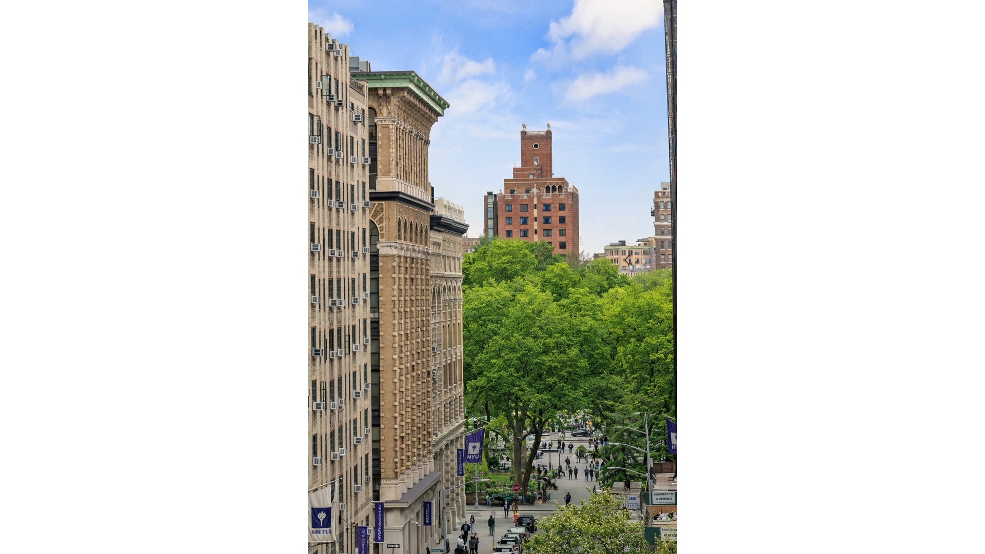 Rich in charm, the apartment features exposed white-painted brick, hardwood floors, and stunning west-facing views overlooking Washington Square Park. The expansive living area is anchored by oversized new windows and flows seamlessly into a fully redesigned chef's kitchen, complete with a striking island, Sub-Zero refrigerator, Viking range, and sleek updated finishes throughout.