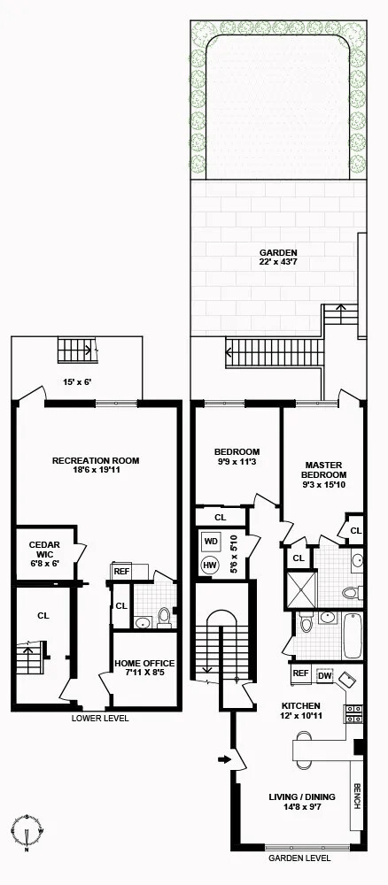 Out back, is one of the nicest, and largest backyards in Park Slope - 22 feet across and over 43 feet deep! The south facing space gets beautiful light and features a large bluestone patio for al fresco dining and grilling, and the remaining turf provides an excellent place to play or relax. The entire space is surrounded by mature trees, trellised vines and bamboo, providing a verdant and private oasis.