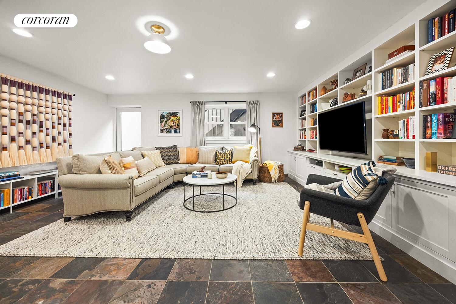 Off the kitchen the landing of the stairs leading to the lower level offers a place to hang coats and such, or add storage cabinets halfway down at the turn of the staircase to create a full mudroom. Additional storage under the base of the stairs ensures no space is wasted. At the bottom of the staircase is an interior room, currently being used as a third bedroom, that would also make a great home office or den. Down the hall, past a hall closet and cedar storage room, is the massive, windowed rec room with custom built-in cabinets for all of your books and objets d'art. This spacious room can accommodate the largest of comfy sectionals and is custom designed for your next movie night. There is also a mini fridge and counter/cabinet as well as a small patio accessed from a door at the rear with stairs leading up to the gorgeous backyard beyond to make entertaining from here a breeze.