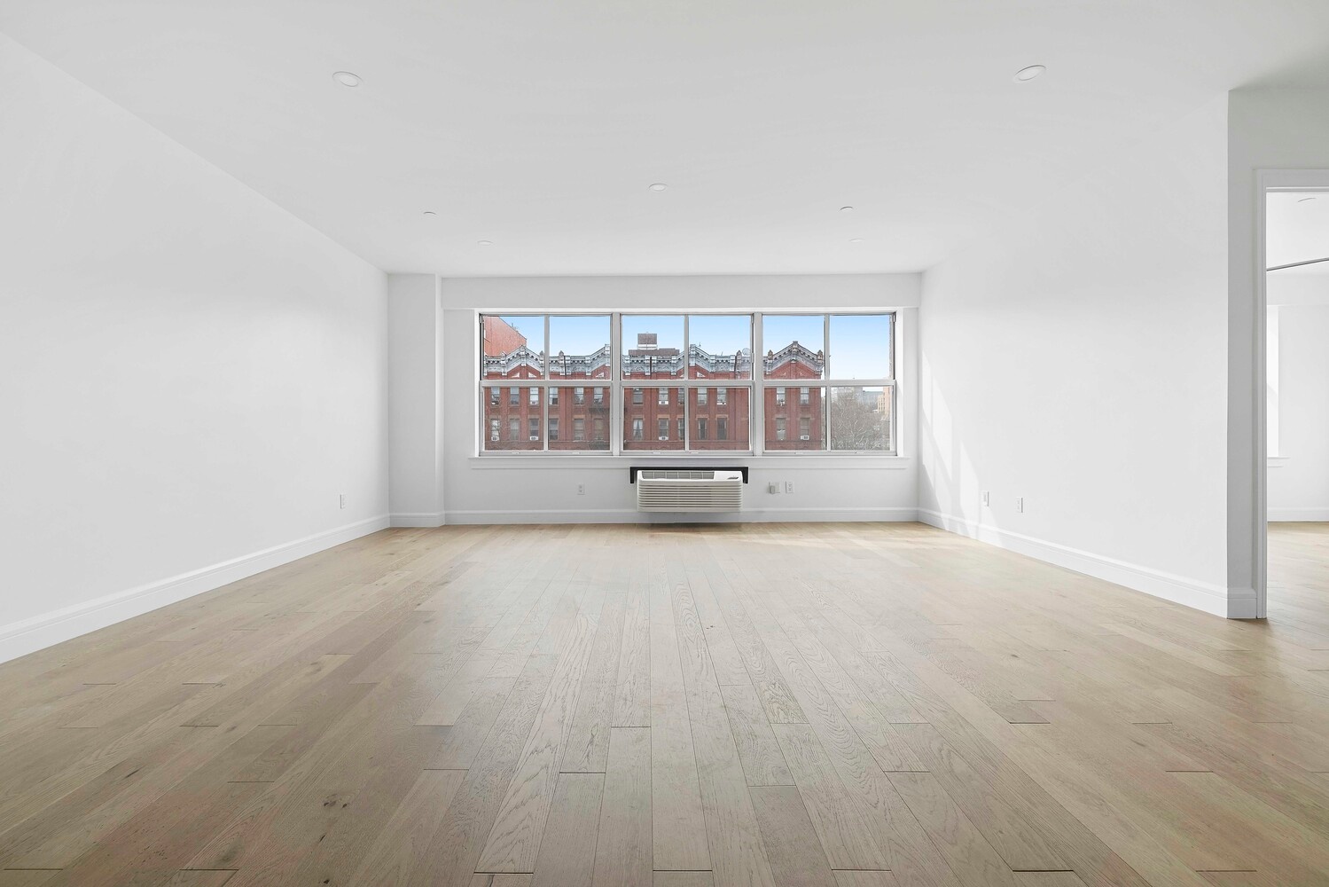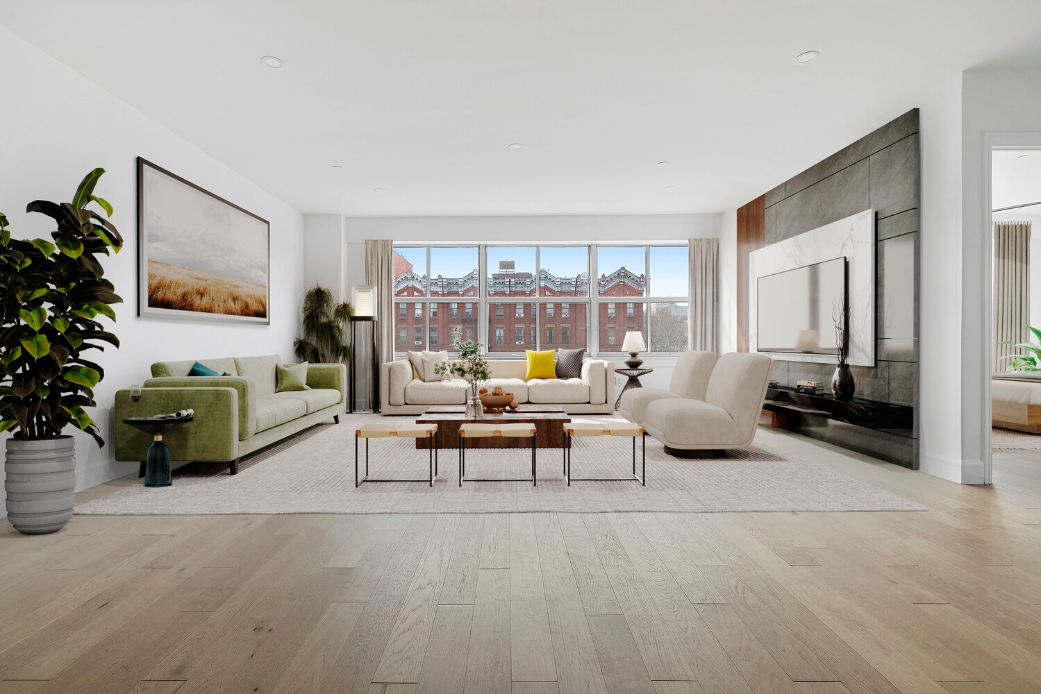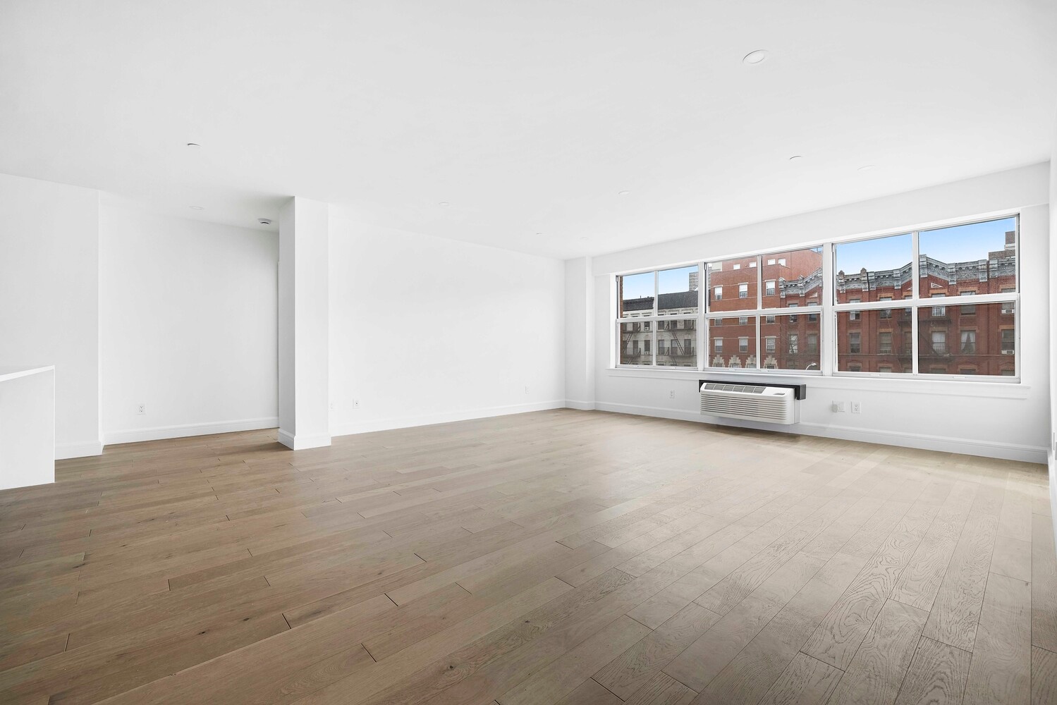 An exceptionally spacious, loft-like great room anchors this 1,229 square foot two-bedroom, two-bathroom condominium, offering a vast, open expanse for living, dining, and entertaining, with the kitchen positioned at the heart of the home. Nearly 23 feet wide, with a broad wall of oversized western-facing windows overlooking an extra-wide, tree-lined Harlem block and historic townhouses beyond, it offers true volume, exceptional light, and a level of openness rarely found in condominium living.