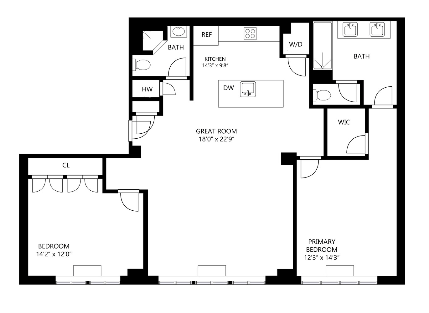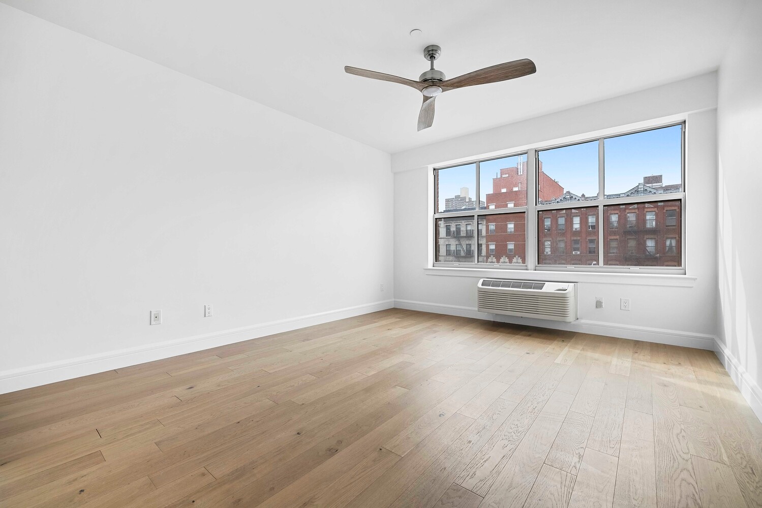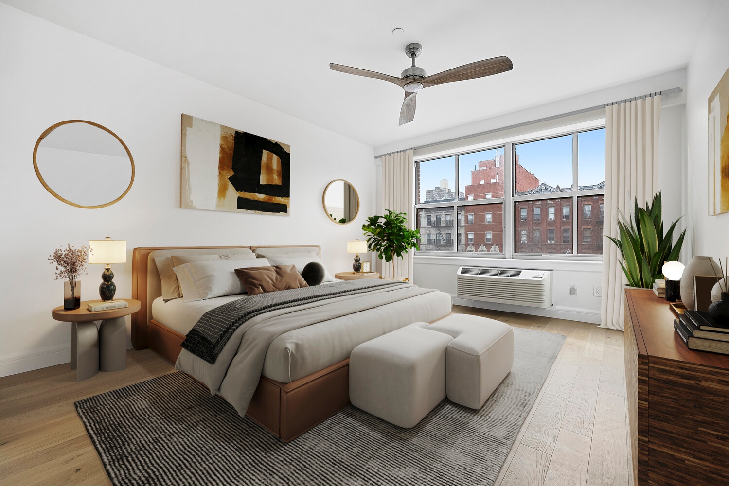 An exceptionally spacious, loft-like great room anchors this 1,229 square foot two-bedroom, two-bathroom condominium, offering a vast, open expanse for living, dining, and entertaining, with the kitchen positioned at the heart of the home. Nearly 23 feet wide, with a broad wall of oversized western-facing windows overlooking an extra-wide, tree-lined Harlem block and historic townhouses beyond, it offers true volume, exceptional light, and a level of openness rarely found in condominium living.