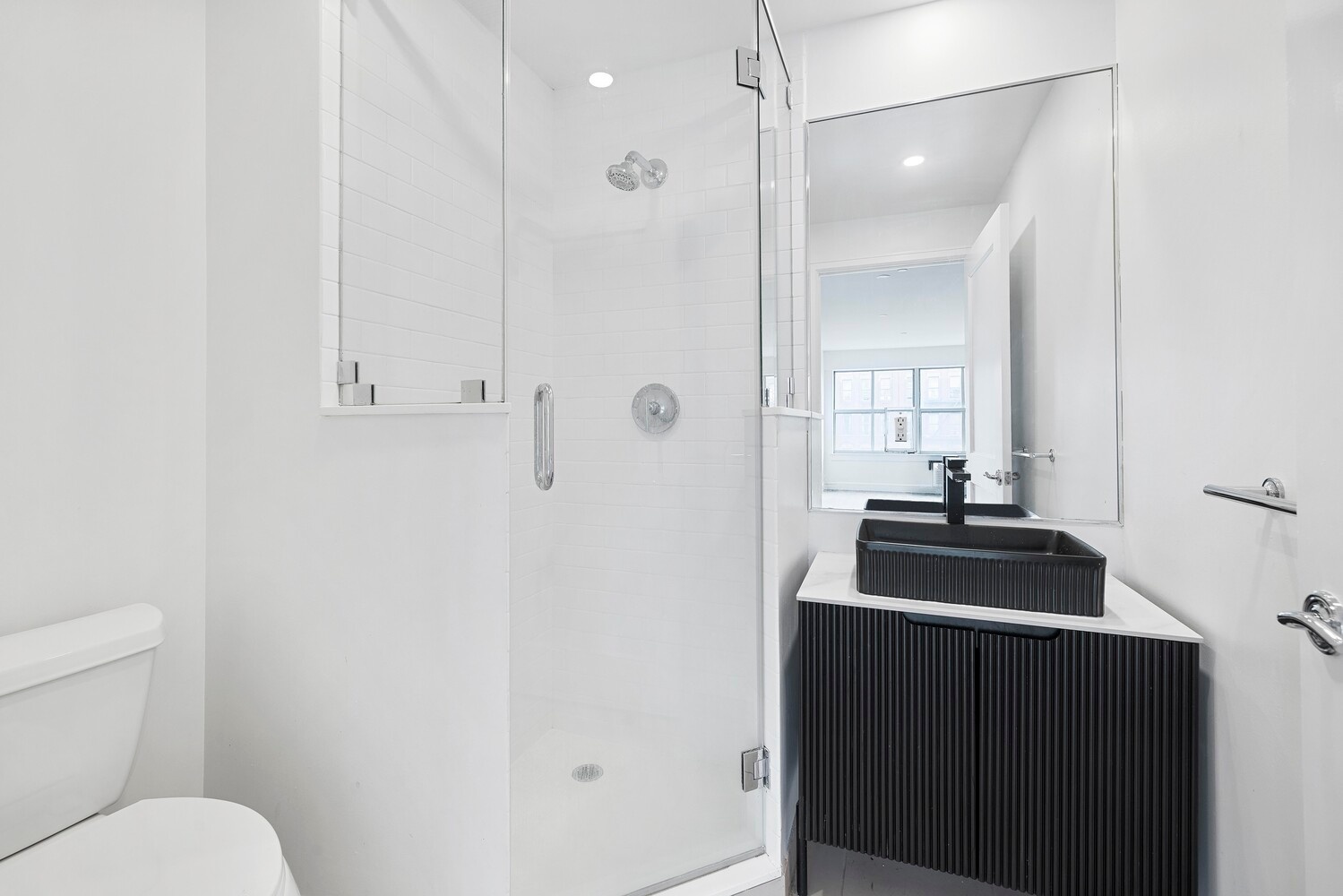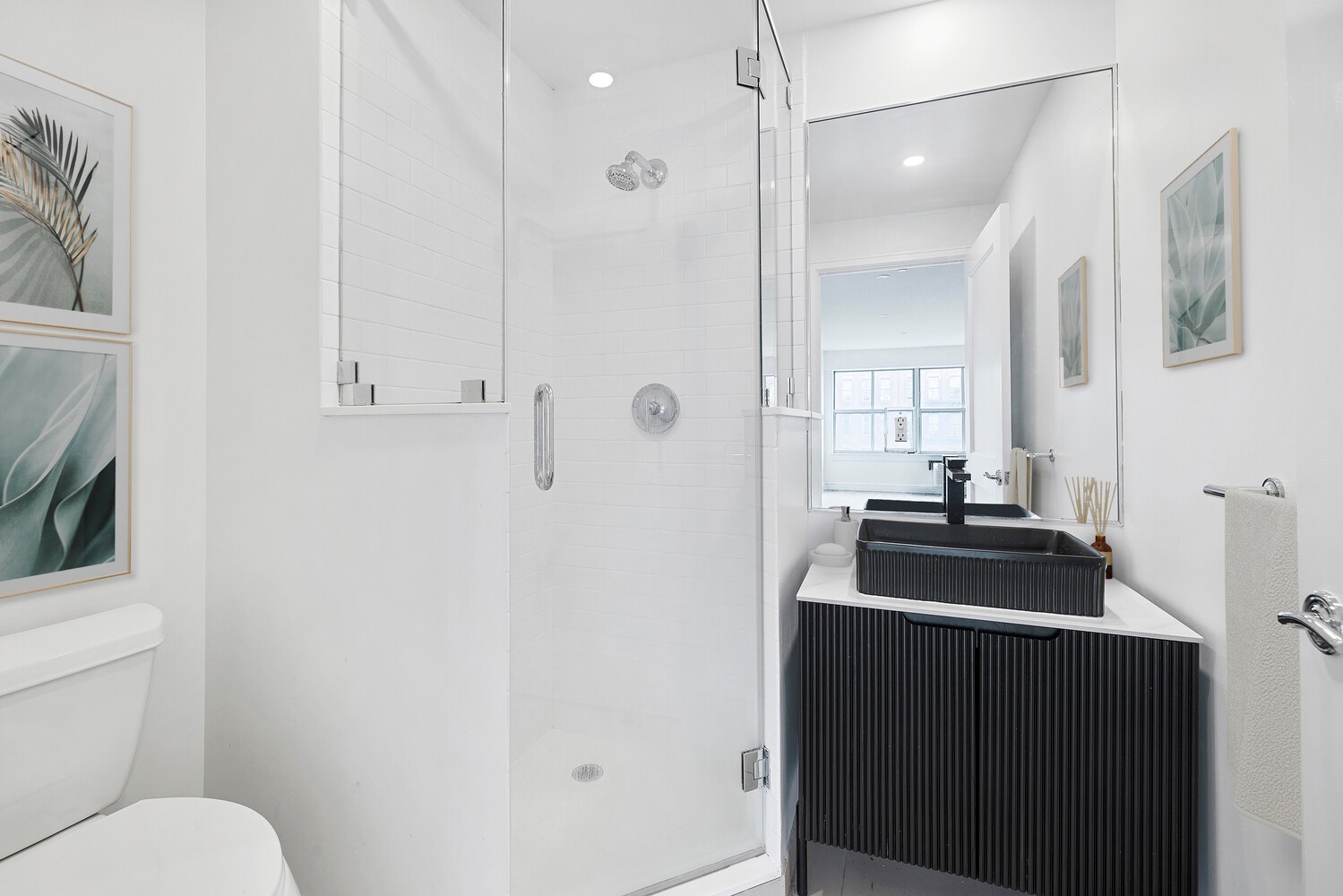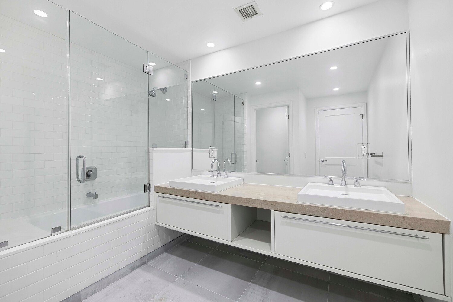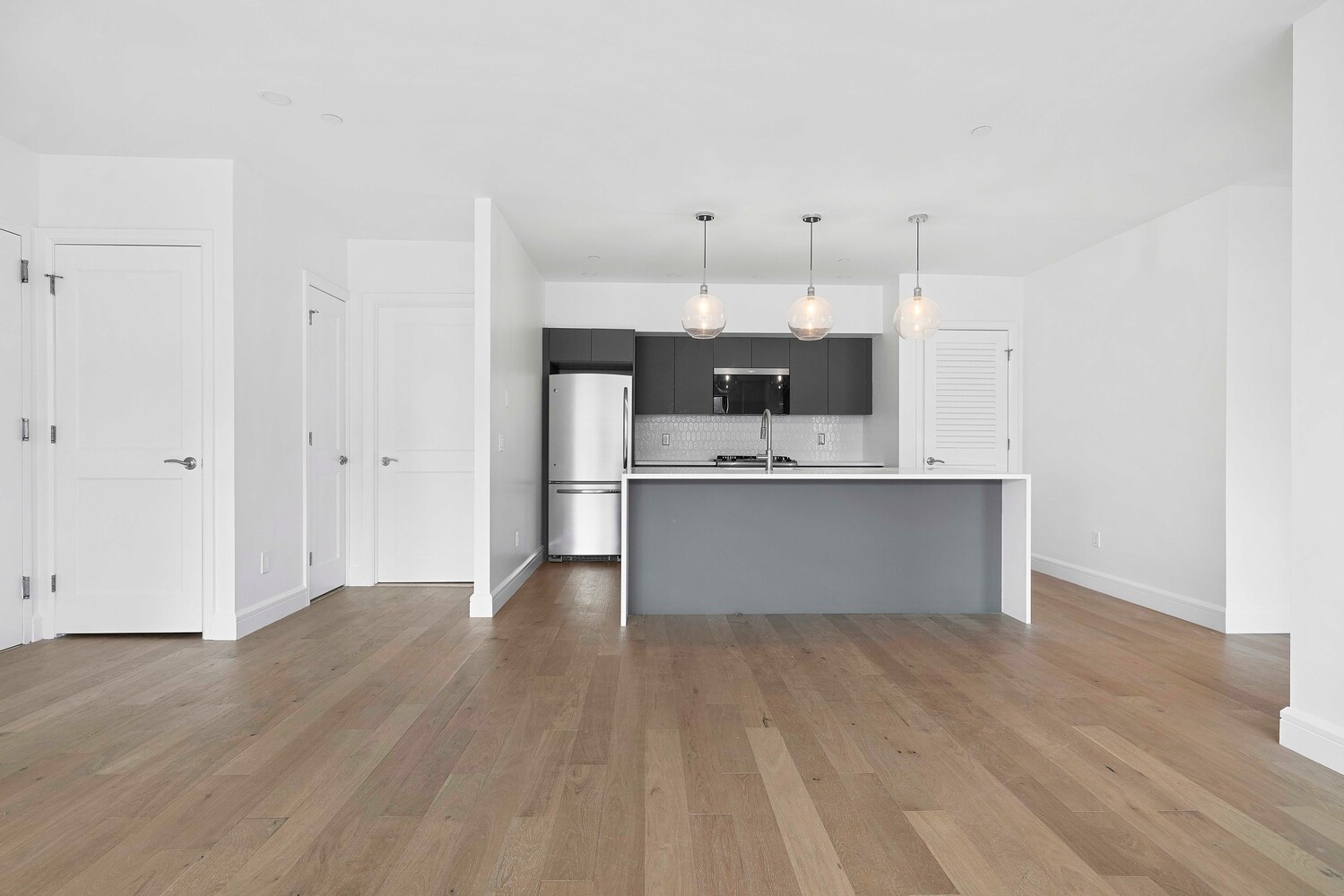 The apartment is in mint condition following recent renovations, including a brand-new kitchen, upgraded bathrooms, and all new flooring throughout. The kitchen features a large island that provides plenty of space for cooking and seating, along with stainless steel appliances, new cabinetry with soft-close hardware, and new quartz countertops. A full-size washer and dryer are discreetly positioned nearby. Wide-plank white oak flooring runs continuously throughout the home, reinforcing the sense of scale and cohesion.