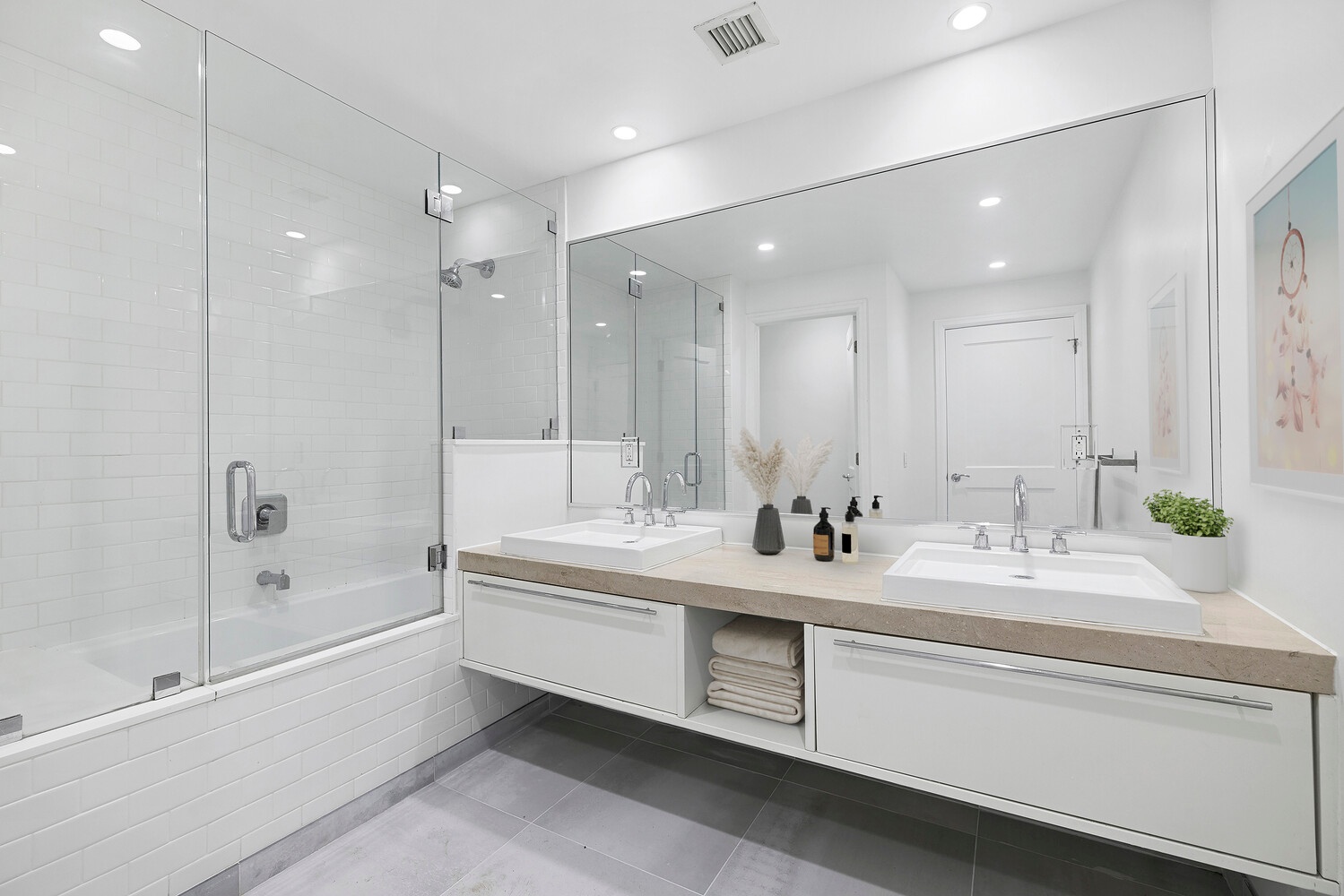 A well-conceived split-bedroom layout provides separation and a high degree of privacy. The primary bedroom is positioned apart from the rest of the home, creating a true suite with a walk-in closet and an en-suite bath featuring a double vanity and a large tub with shower. The second bedroom is equally well-scaled with excellent closet space and offers flexibility as a guest room, home office, or den. A second full bath features a glass-enclosed shower.