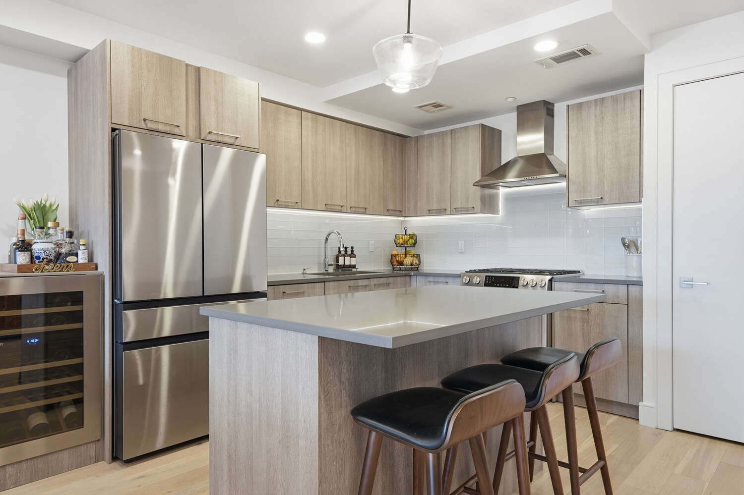 This rarely available home checks ALL of your boxes. The great room is significantly larger than anything else you will find in a 2br/2ba condo nearby. Extending nearly 35' x 17', there is plenty of space for lounging, dining, working and playing with extra room to spare! Off the great room is a large private balcony with west-facing sunset views. The oversized kitchen features premium stainless-steel appliances, high-end Leicht cabinetry, an island with counter seating for three, a large built-in wine fridge and deep Costco closet for all of your pantry staples.