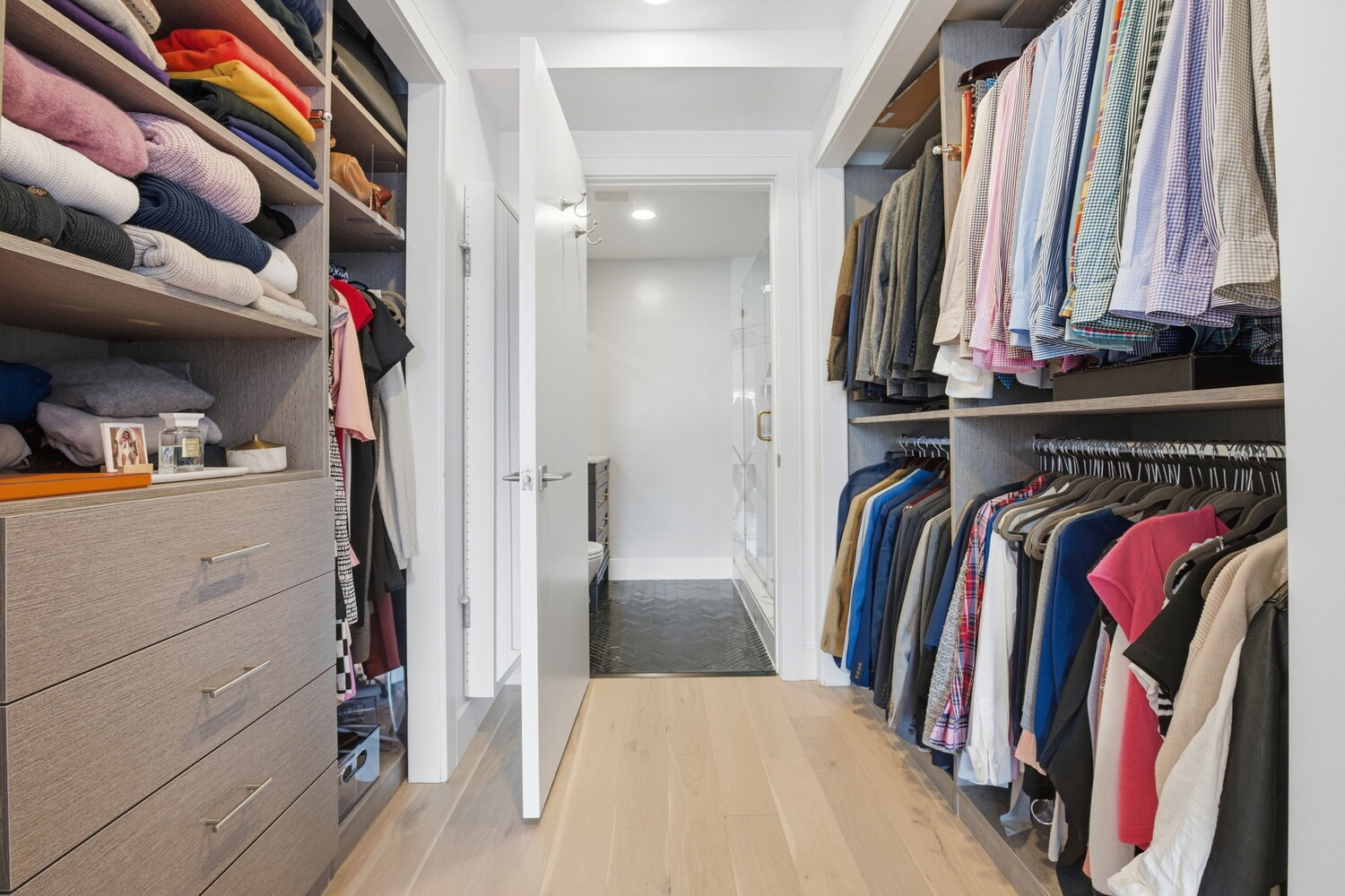 The bedroom wing includes a king-size primary suite with a custom-outfitted closet/dressing area leading to the spa-like en suite bathroom with a walk-in shower. The adjacent well-proportioned second bedroom has great light and closets. There is a second full bathroom with deep soaking tub easily accessible right across the bedroom wing hallway. Other features include wide plank oak floors, central air/heat, exceptional storage, and pre-wired ceiling speakers. There is also a dedicated laundry closet with an oversized vented washer/dryer.